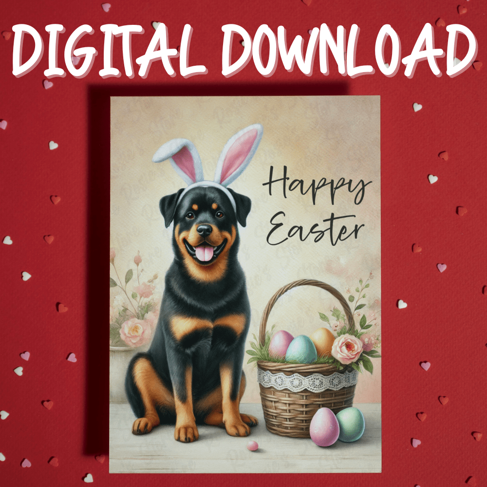 Download your printable card today and send Easter smiles with this adorable Rottweiler design! 🐾🐣💖