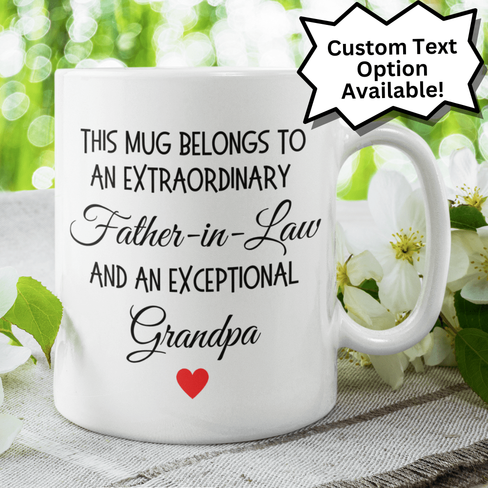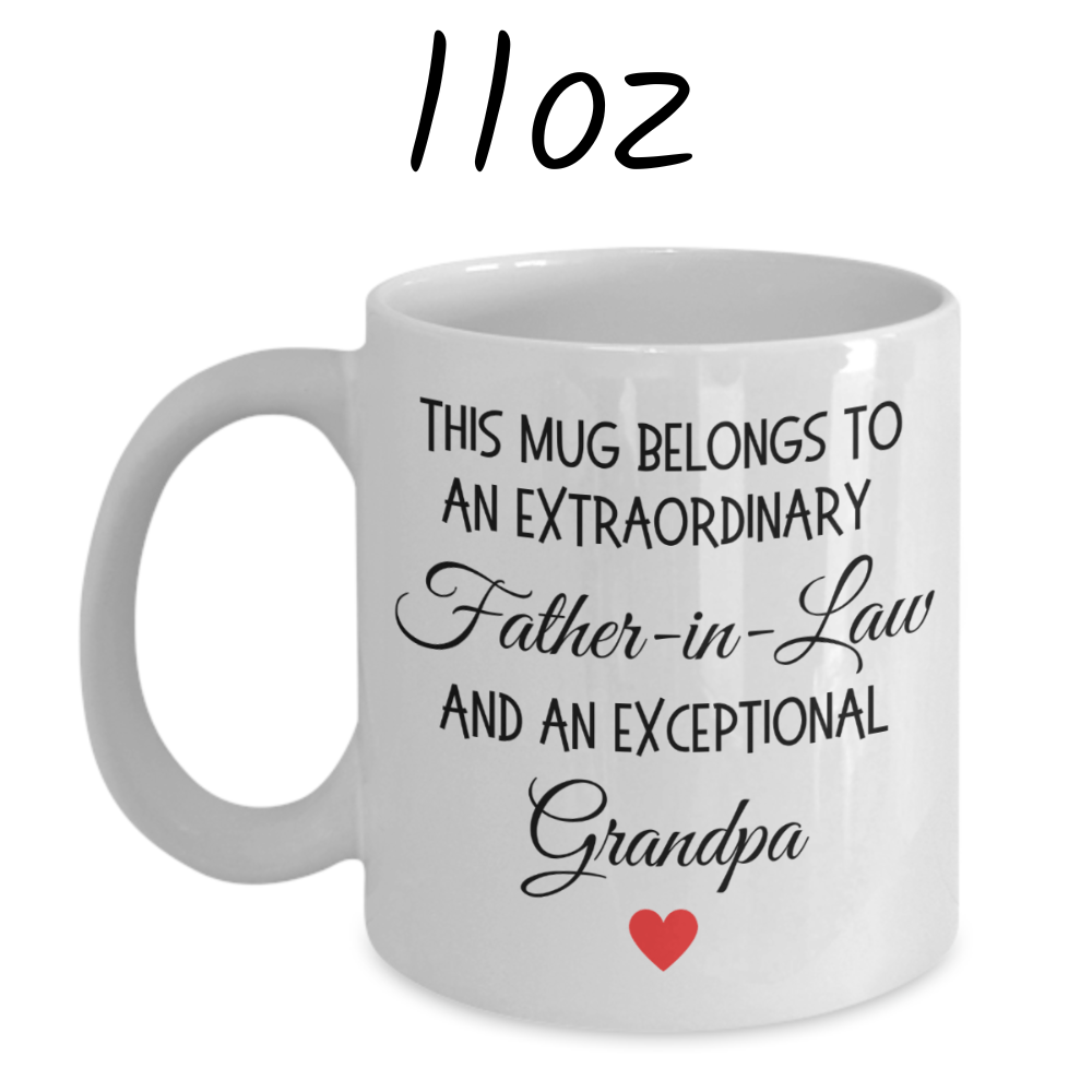 With the "This mug belongs to an extraordinary Father-in-Law and an exceptional Grandpa" coffee mug, you give more than just a mug; you give recognition and love, making his every sip a reminder of his importance to your family.