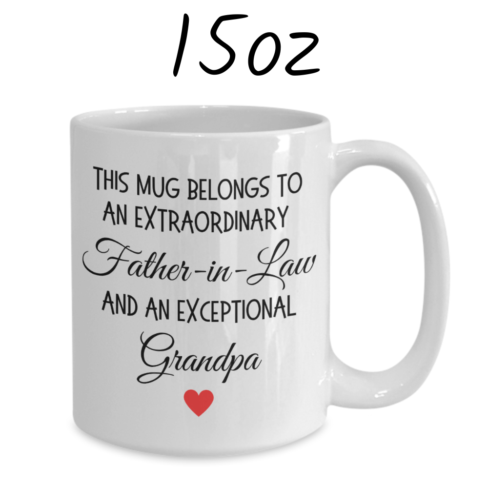 • The mug features a respectful and loving tribute to him, recognizing him as both a cherished father-in-law and a wonderful grandpa, making it a great addition to his morning routine or coffee break.