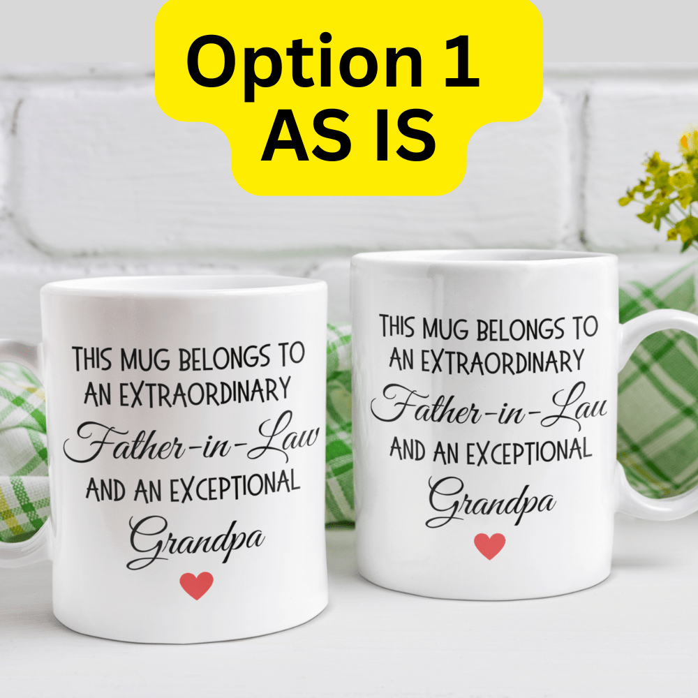 • Option 2: Personalize the mug with your father-in-law's name and a short heartfelt message, enhancing the sentimental value and making it a one-of-a-kind gift.