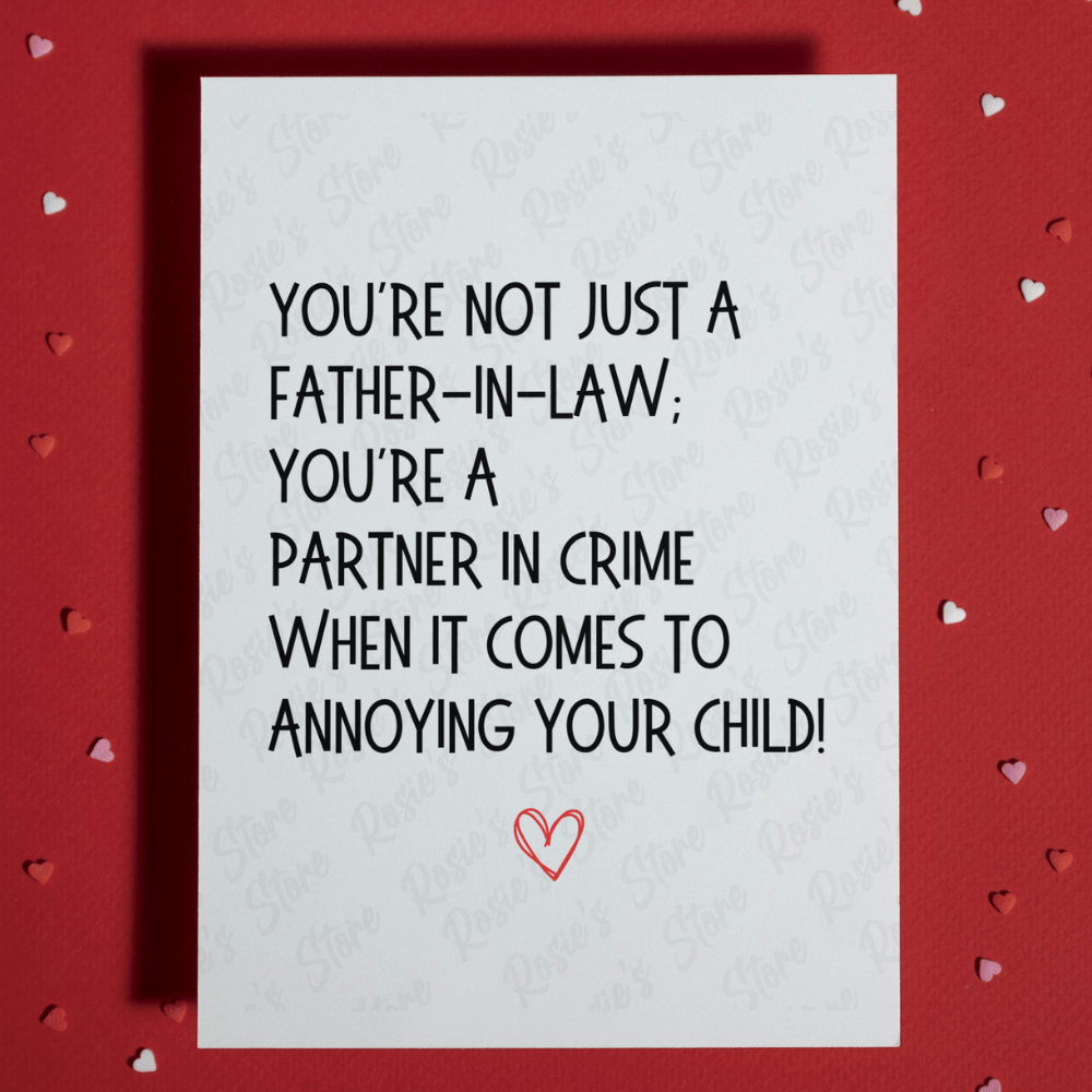 Introducing our hilarious and playful greeting card: "You’re not just a father-in-law; you’re a partner in crime when it comes to annoying your child!" This card, perfect for those who share a fun and mischievous bond with their father-in-law, measures 4.25" x 5.5" and is made from high-quality, ACID-FREE, thick, and durable paper - proudly MADE IN USA! A white envelope is included with each card for added convenience.