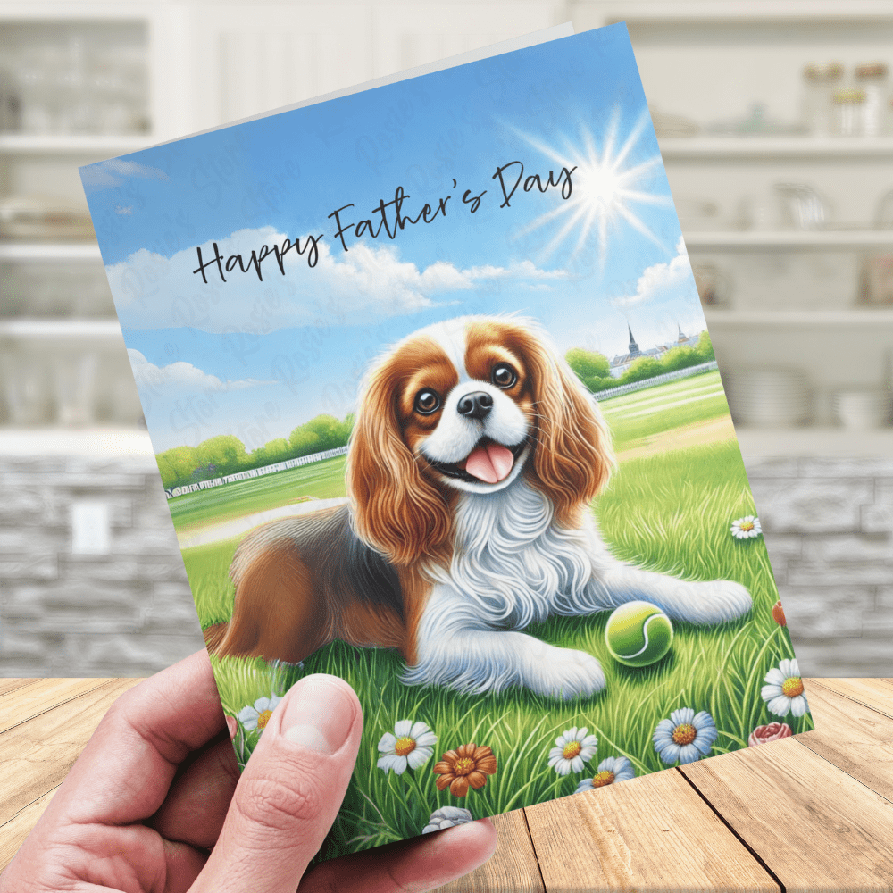 This card is a thoughtful and adorable way to celebrate any dog-loving dad, especially those who adore their Cavalier King Charles Spaniel companions!
