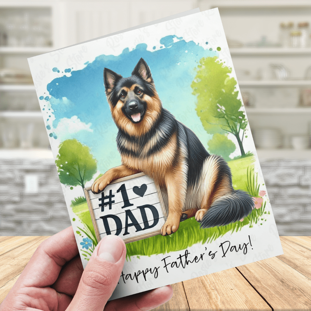 Design: Features a beautiful watercolor illustration of a German Shepherd resting its paw proudly on a "#1 DAD" sign, perfectly capturing loyalty, love, and admiration — just like Dad deserves!