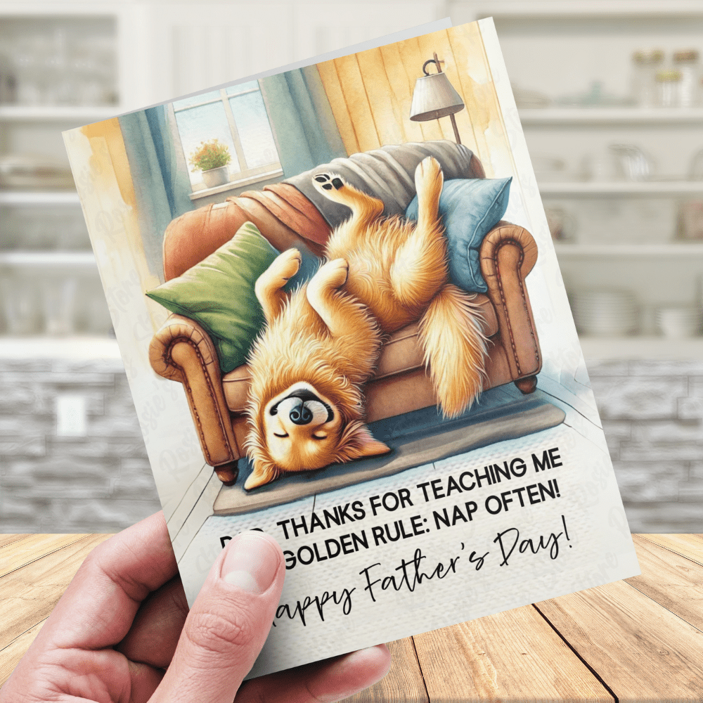 This funny and heartfelt Father's Day card is ideal for any dad, father figure, or dog-loving dad, especially if he shares a love for comfy chairs and power naps with his Golden Retriever.