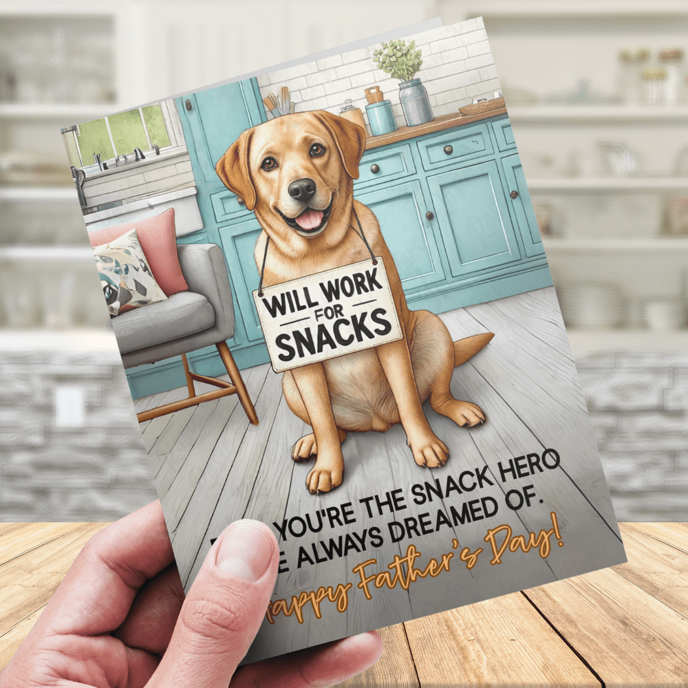 This funny and heartwarming Father's Day card is perfect for any dad, father figure, or dog dad, especially one who knows the importance of snacks and unconditional love — just like a loyal Labrador Retriever.