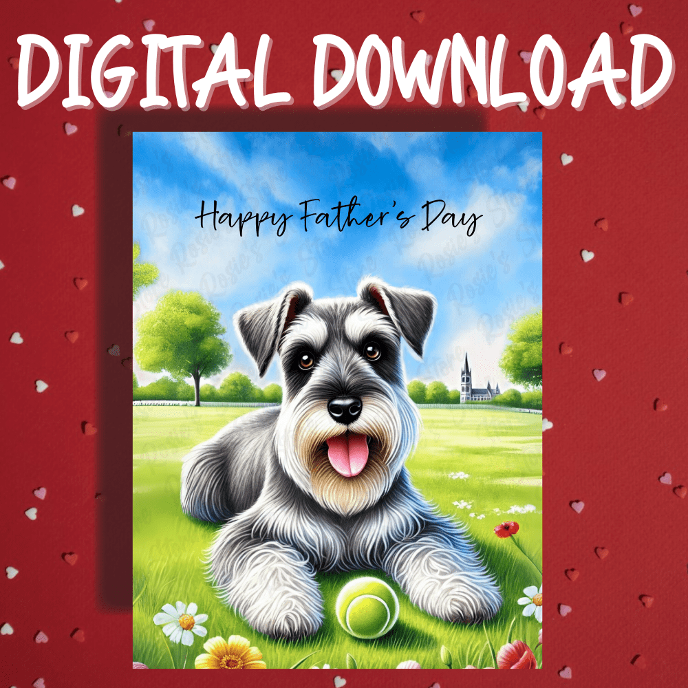 - Design: Features a charming watercolor illustration of a lovable Schnauzer laying in the grass with its favorite fetching ball placed proudly between its front paws โ the perfect tribute to the dad whoโs always up for a good game and great snuggles.