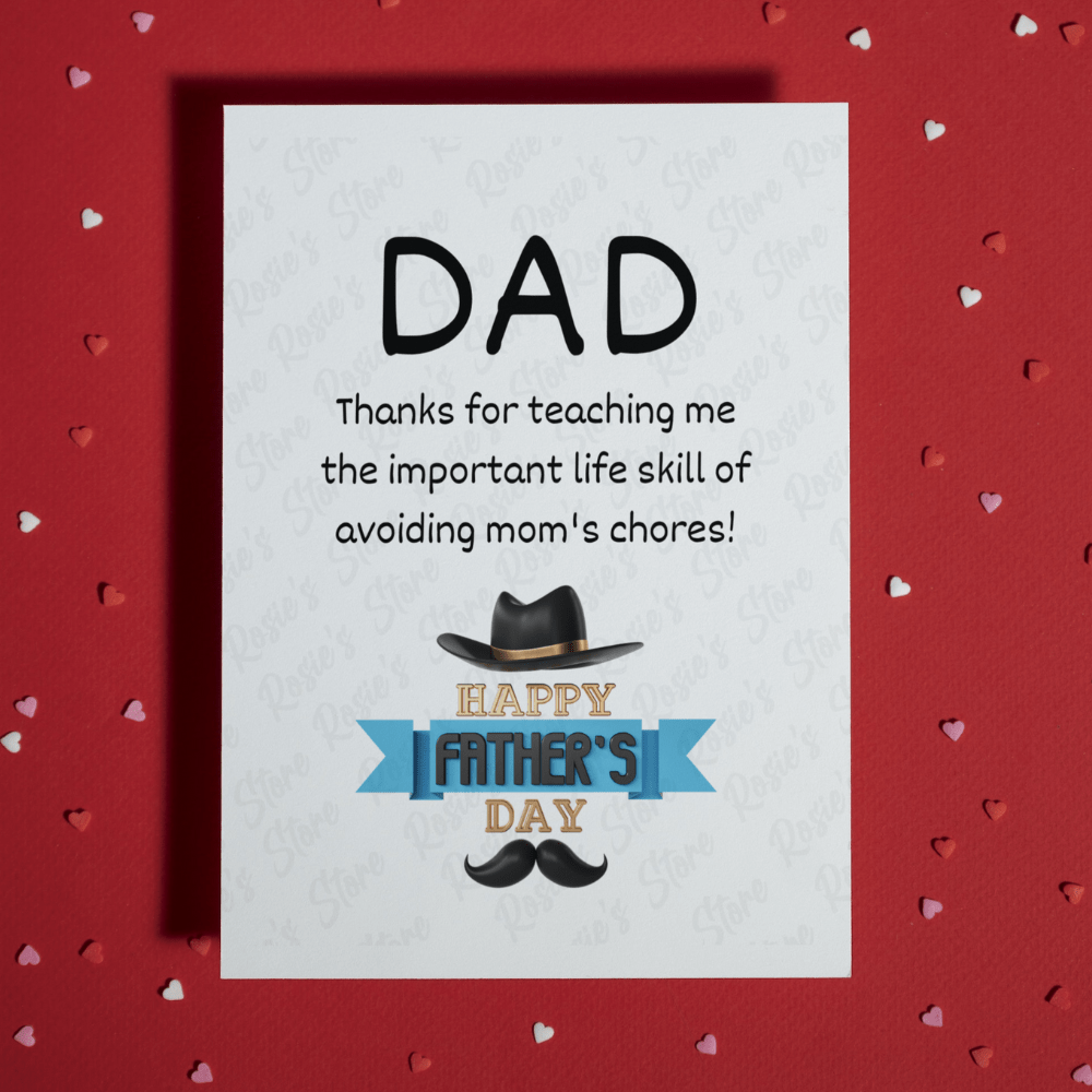 Introducing our uproariously funny greeting card, specially crafted to celebrate the art of avoiding mom's chores! Say a big "Thank you" to your dad with our "Dad, thanks for teaching me the important life skill of avoiding mom's chores! Happy Father's Day" card! This hilarious card measures 4.25" x 5.5" and is guaranteed to bring laughter to your dad's special day.