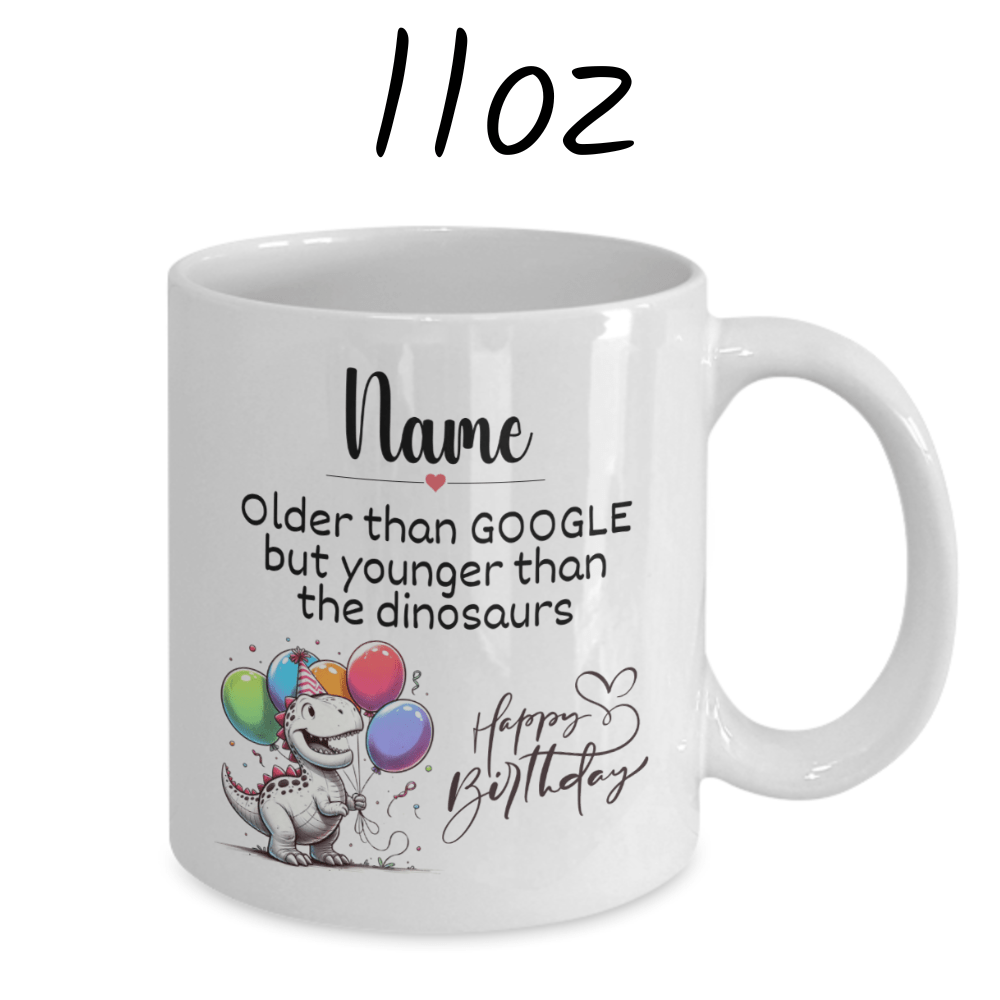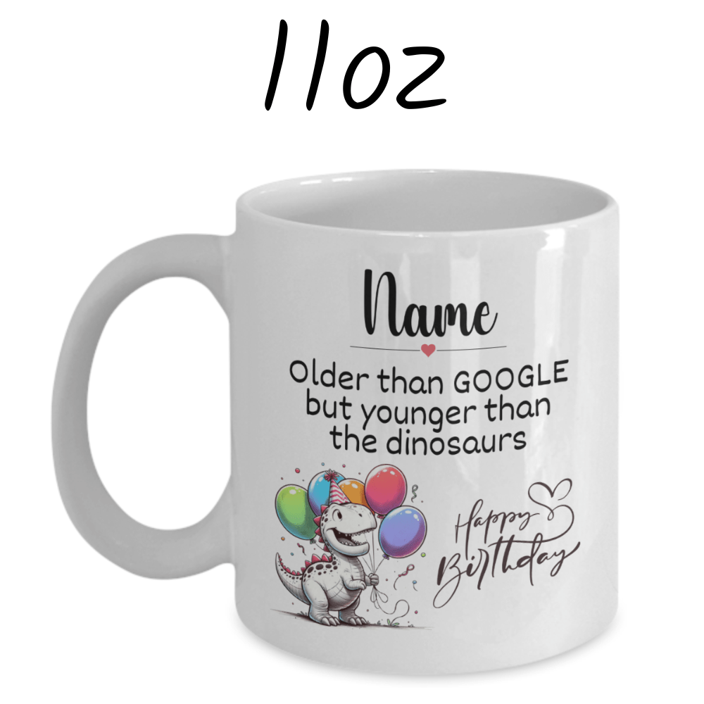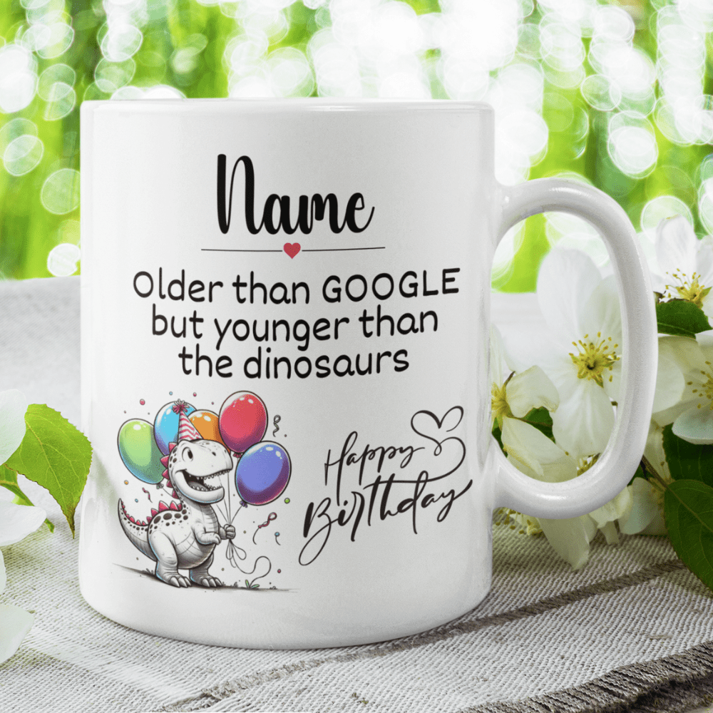 Make their birthday roar with laughter with our hilarious white ceramic coffee mug! Featuring the witty message: "Older than Google but younger than the dinosaurs. Happy birthday" and adorned with an adorable cartoon drawing of a birthday dinosaur, this mug is sure to bring joy to anyone celebrating their special day.
