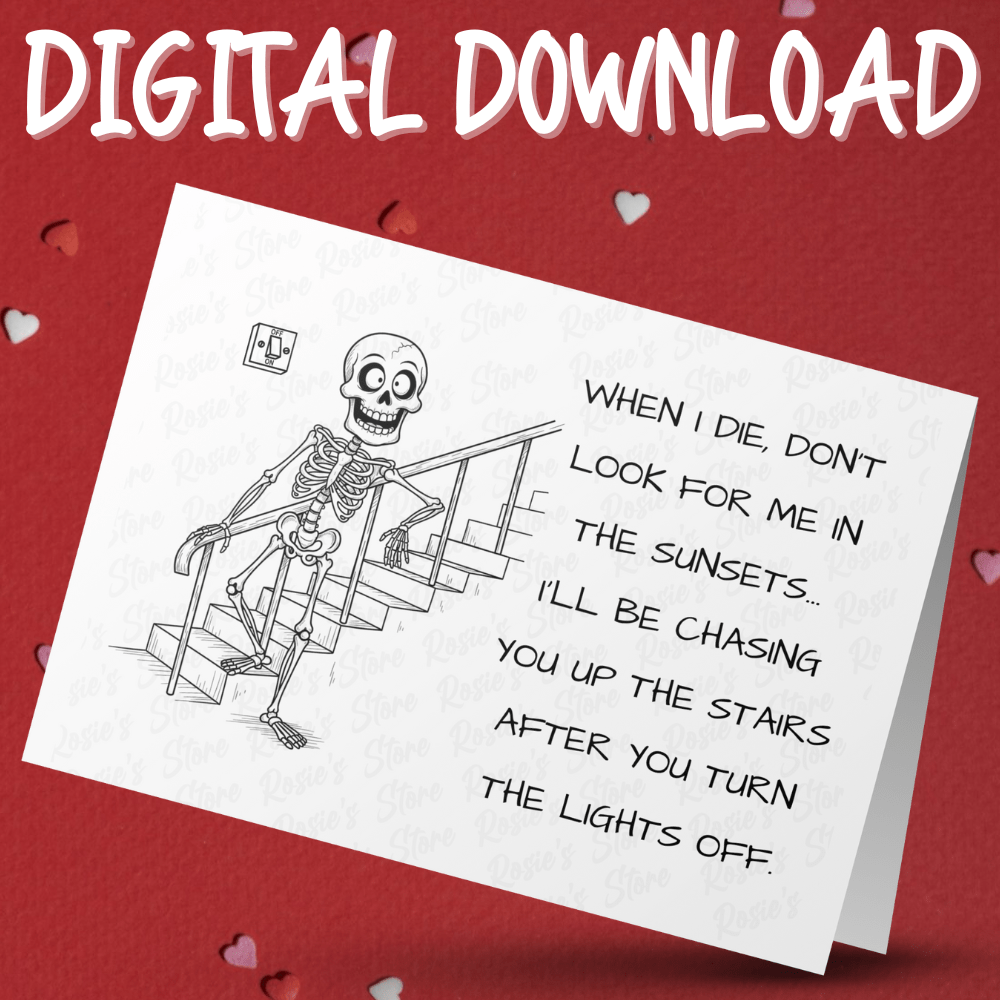 😂 Give them a good scare and a hearty laugh with our hilariously dark "When I die, don’t look for me in the sunsets... I’ll be chasing you up the stairs after you turn the lights off" greeting card! 💀💡 This quirky card features a side-splitting pencil drawing of a skeleton ready for some post-mortem mischief by a light switch.