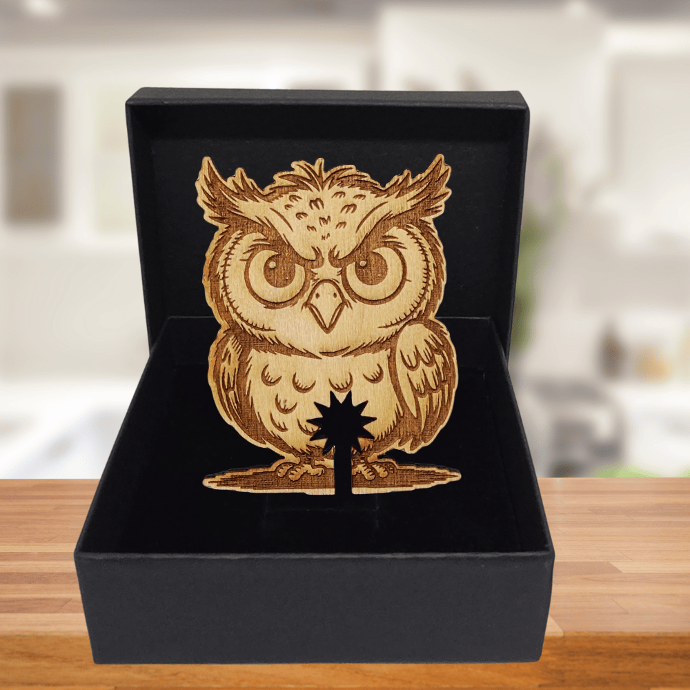 Add a touch of humor and personality to your kitchen with this funny handmade wooden owl bread clip! Each angry little owl is carefully laser cut and engraved from premium engineered wood, featuring a sharp look that warns everyone to stay away from your loaf! 🦉 The default engraved message on the back, “Back off, I’m watching,” makes it the perfect blend of charm and sass.