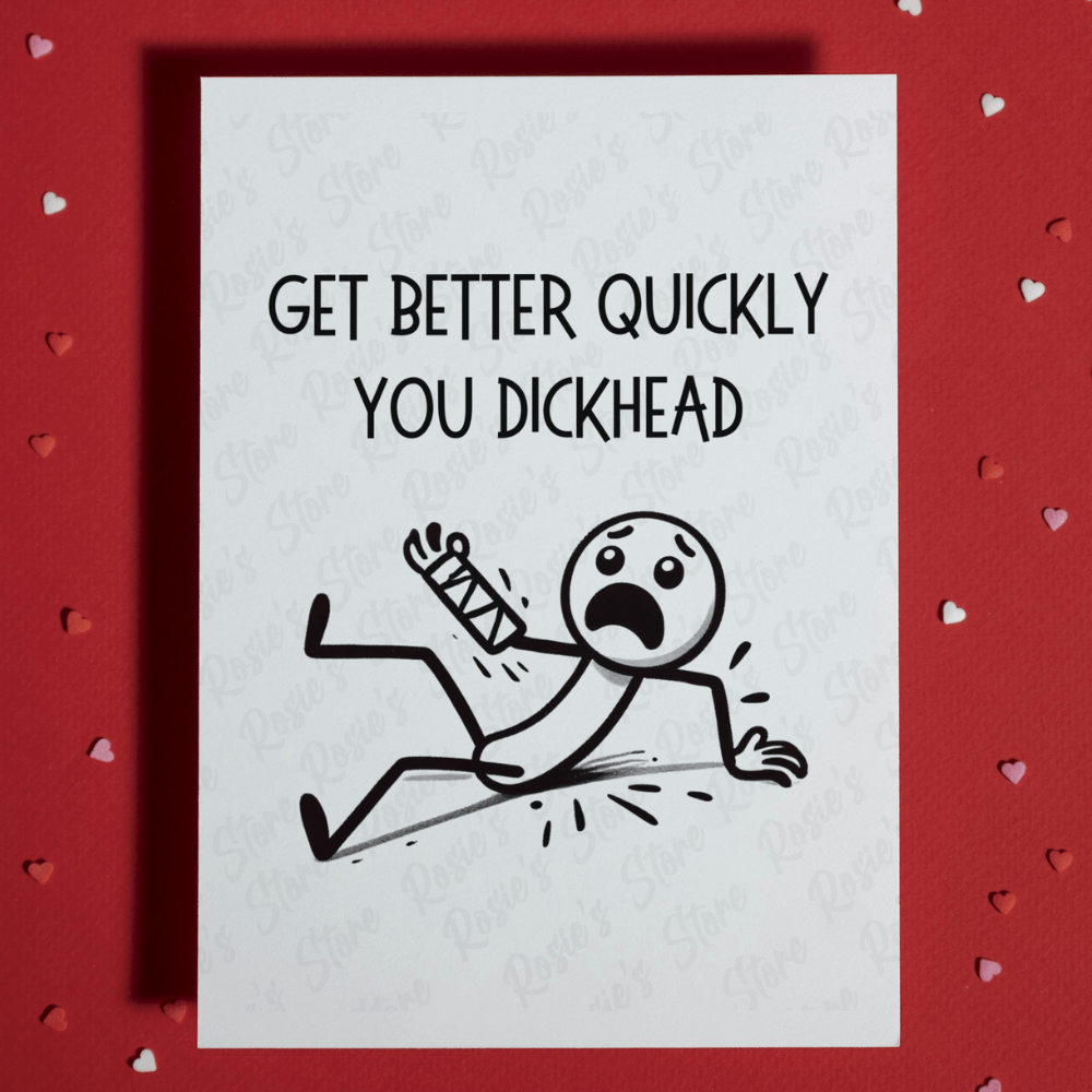 - Front Cover: Features a funny and straightforward message, "Get better quickly you dickhead," accompanied by a cartoon drawing of a stick man with a broken arm. This humorous statement and playful illustration are perfect for making your friend laugh despite their situation.