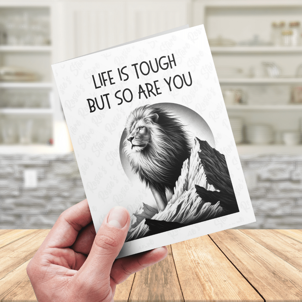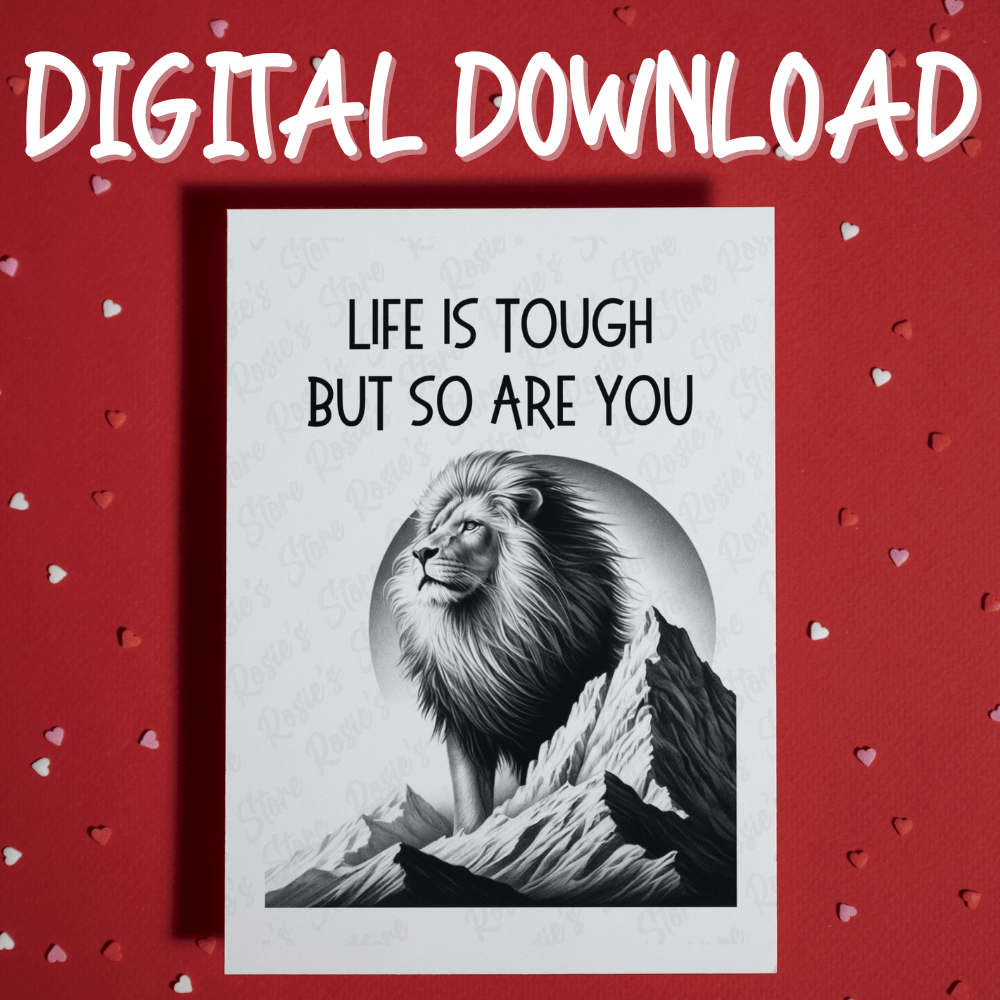 This card, available in both .png and .pdf formats, measures 4.25" x 5.5" and features a charming pencil drawing of a lion standing proudly atop a mountain—a powerful symbol of resilience and strength.