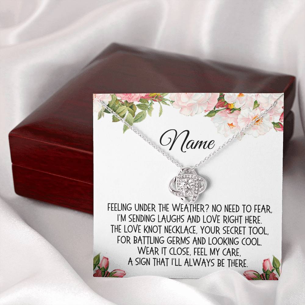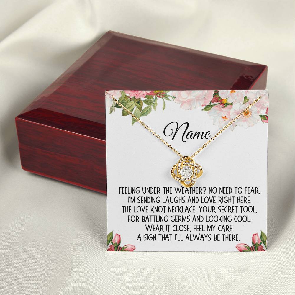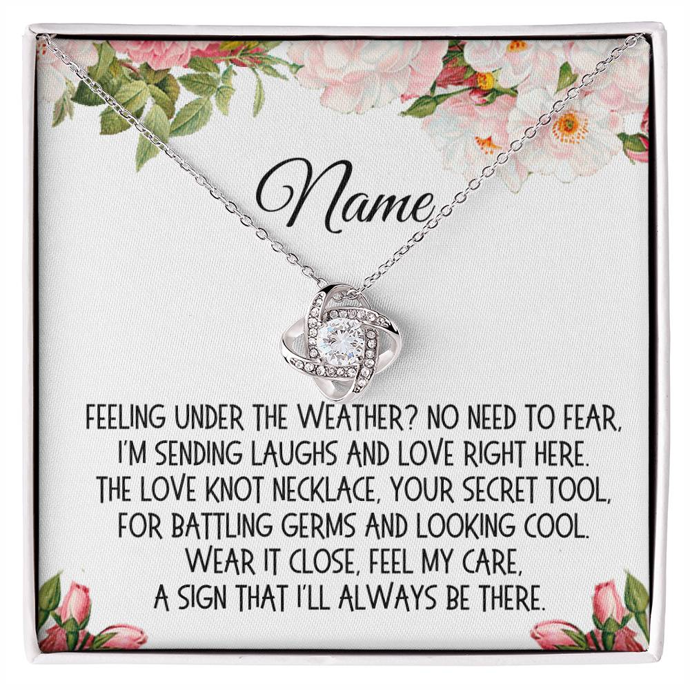 The message card, featuring a lovely cartoon drawing of flowers, carries a heartfelt and comforting message: "‘[Name]’ Feeling under the weather? No need to fear, I'm sending laughs and love right here. The love knot necklace, your secret tool, for battling germs and looking cool. Wear it close, feel my care, A sign that I'll always be there." Customize this message by replacing '[Name]' with the recipient's name to make it deeply personal and supportive. Just click the button 'Personalize It' and enter the custom text.