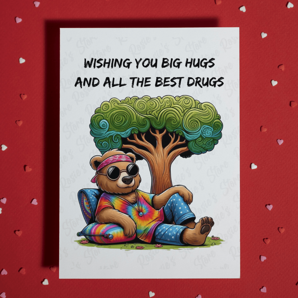 The front of the card showcases a delightful cartoon drawing of a bear chilling by a tree, setting a relaxing and humorous tone. The message reads: "Wishing you big hugs and all the best drugs" It's a playful way to send your warm wishes and bring a smile to their face during challenging times or just to spread joy!