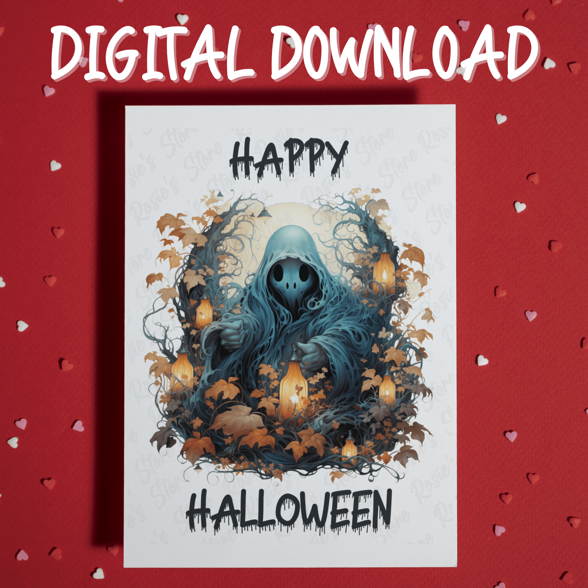Welcome to our digital download shop, where the spooky season comes to life with our Halloween greeting card featuring a charming cartoon drawing of a ghost in the moonlit woods.