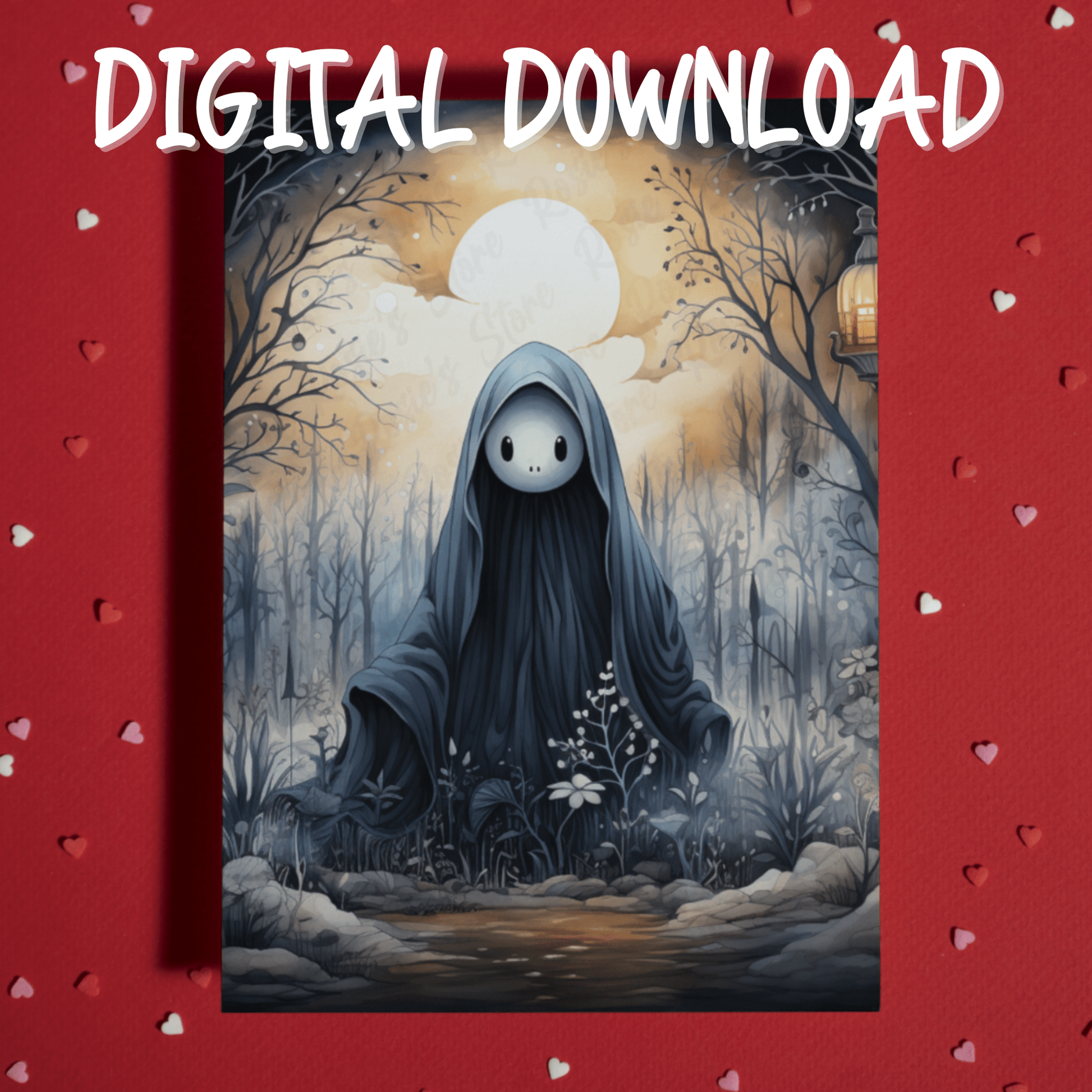 Welcome to our digital download shop, where the spooky season comes to life with our Halloween greeting card featuring a charming cartoon drawing of a ghost in the moonlit woods.