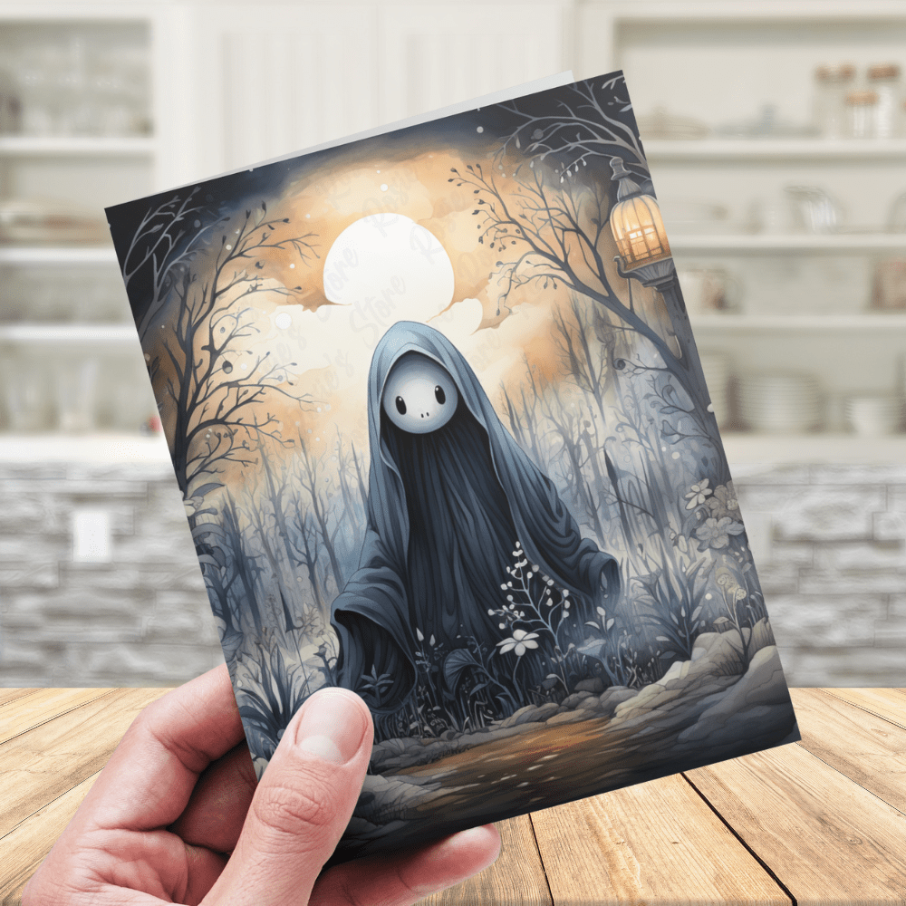 A Spooky Delight: Embrace the spirit of Halloween with our one-of-a-kind card, featuring an illustrated ghost amidst a moonlit forest. It's the perfect blend of spooky and whimsical.