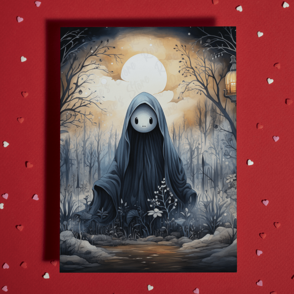Introducing our enchanting Halloween greeting card, featuring a captivating cartoon drawing of a ghost standing amidst a moonlit forest. Measuring 4.25" x 5.5", this card captures the mysterious allure of the Halloween season and sets the stage for a bewitching celebration.