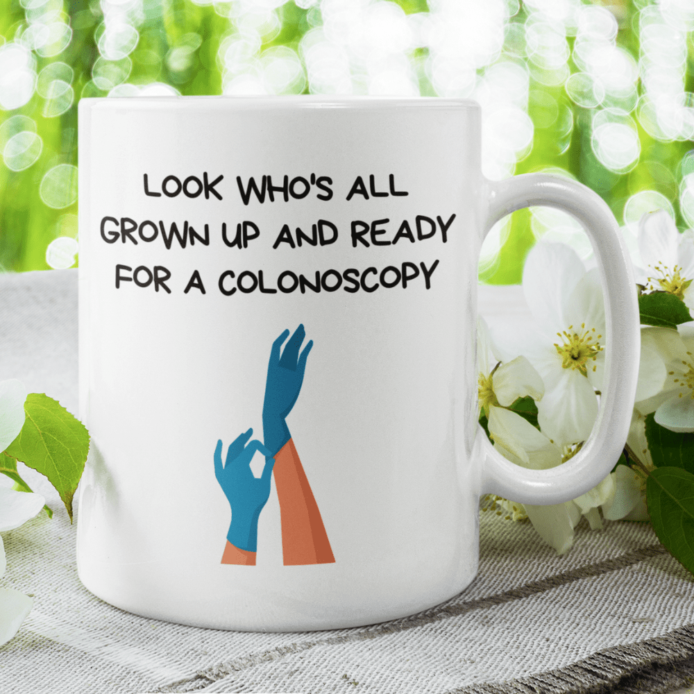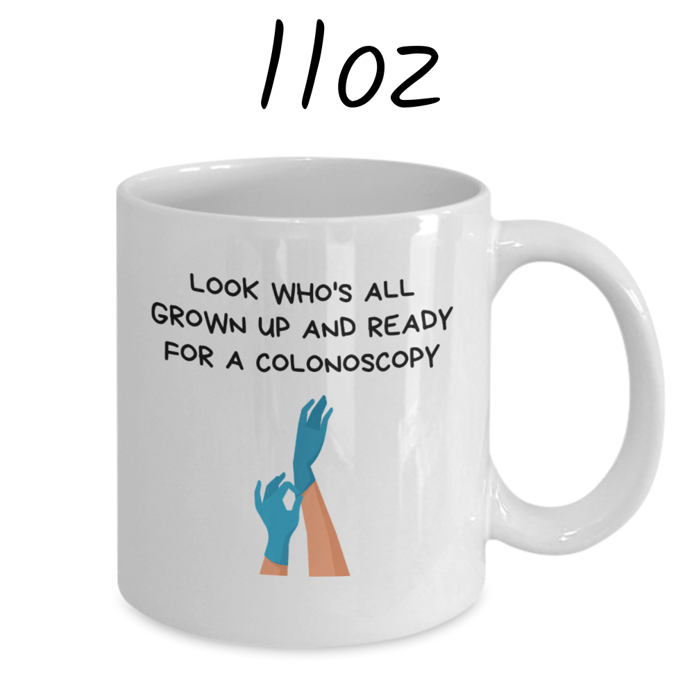 Celebrate the journey of adulthood in a lighthearted way with our hilarious white ceramic coffee mug, specially designed for those gearing up for a colonoscopy. Featuring the witty phrase, "Look who's all grown up and ready for a colonoscopy" this mug is sure to bring a smile to anyone's face, no matter the occasion.