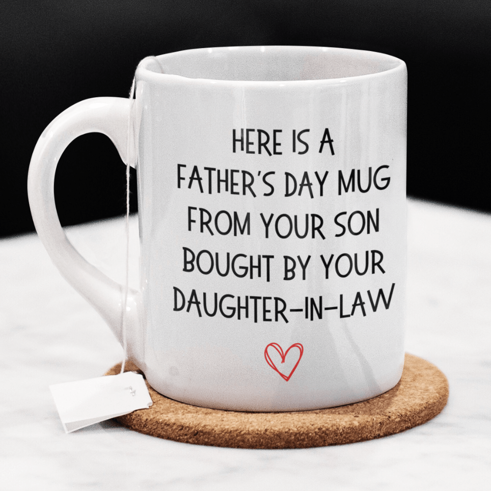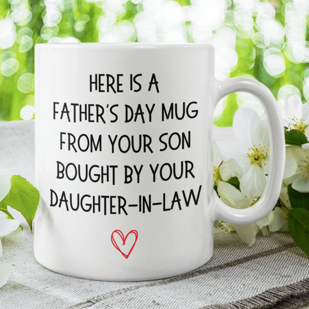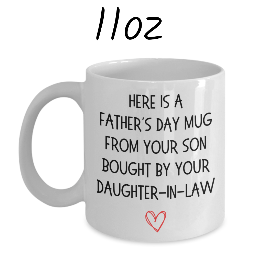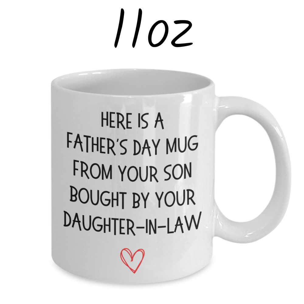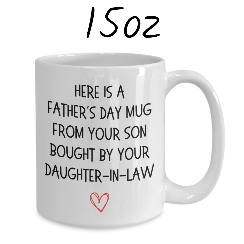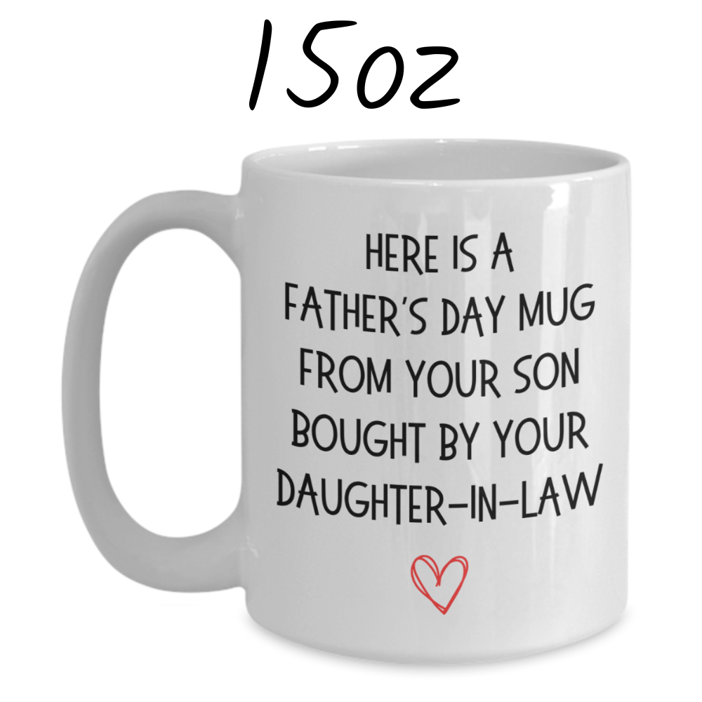 Brighten your father-in-law's Father's Day with a cheeky twist using our coffee mug that cleverly states, "Here is a Father's Day mug from your son bought by your daughter-in-law." This mug is perfect for adding a bit of humor to his day and showing your appreciation in a playful way.