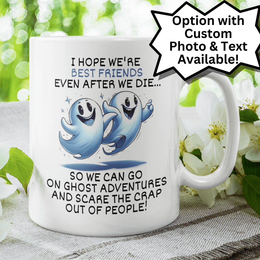 Celebrate the eternal bond of friendship with our white ceramic coffee mug, featuring the whimsical quote: "I hope we're best friends even after we die...So we can go on ghost adventures and scare the crap out of people!" Whether you're sipping your morning brew or sharing late-night laughs, this mug is sure to bring joy to every moment.