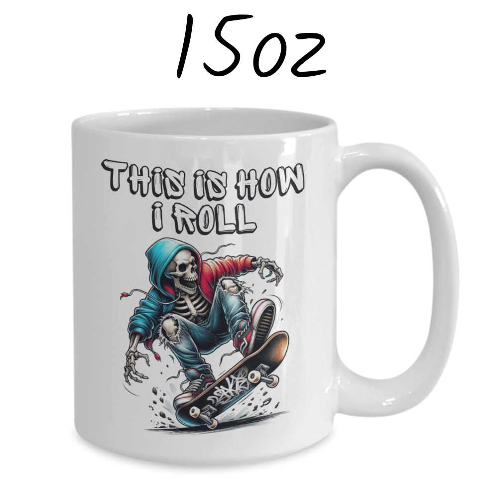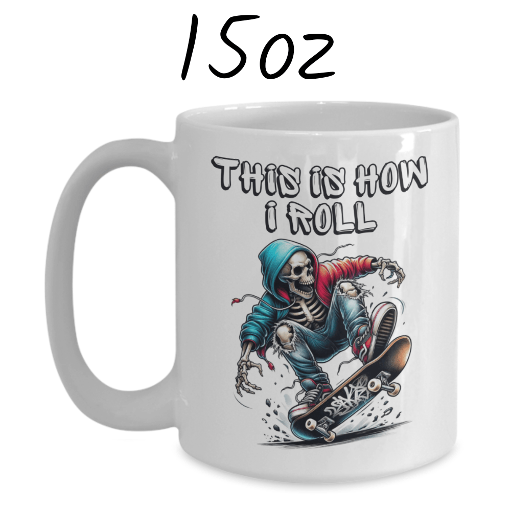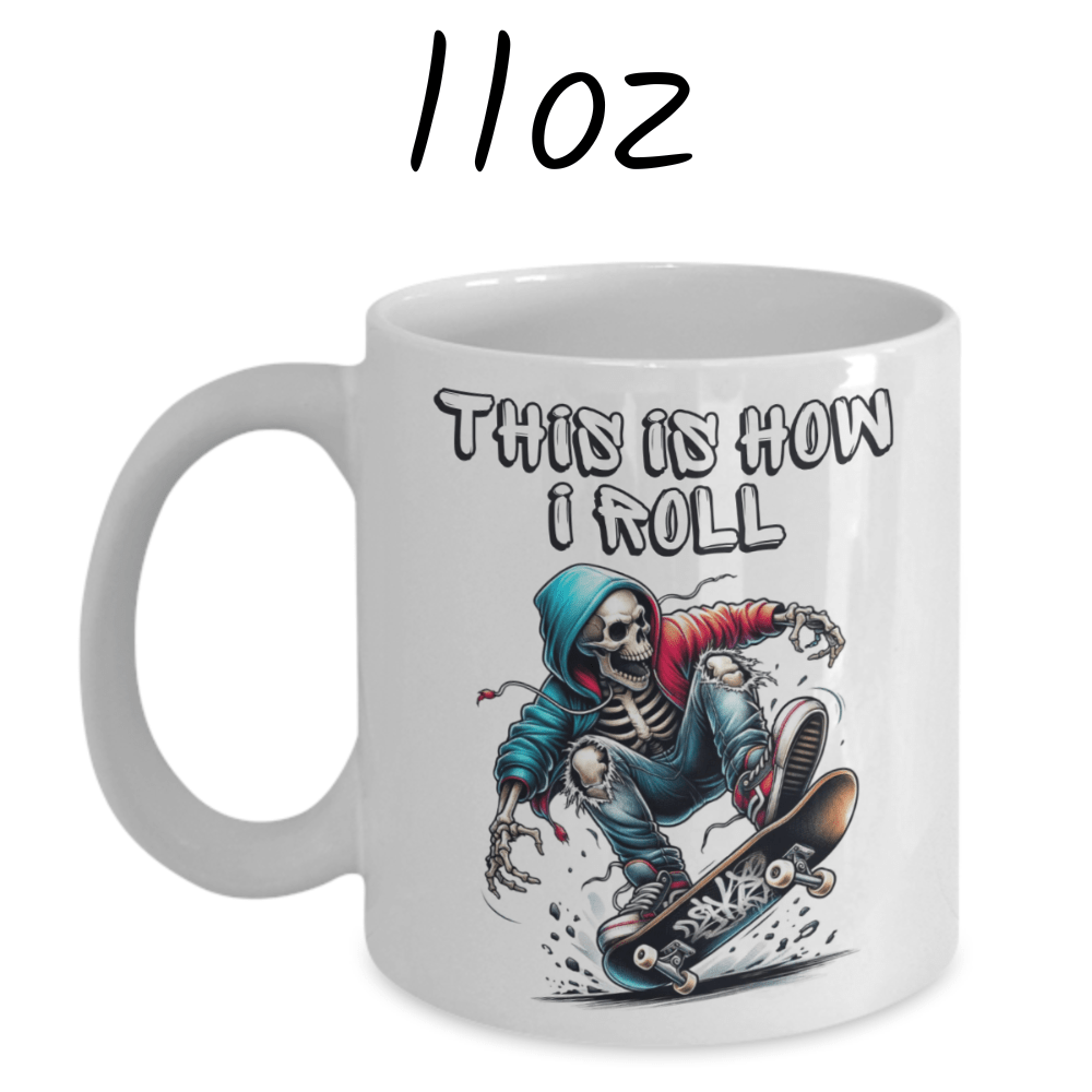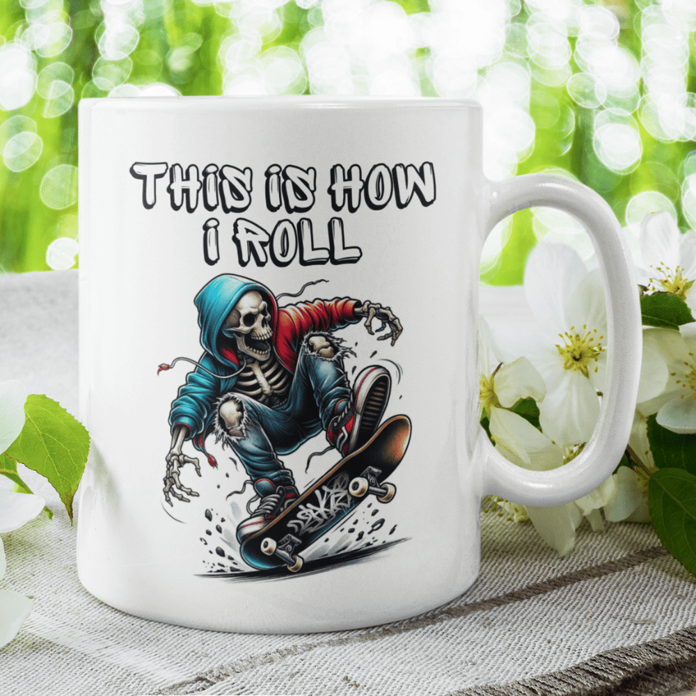Introducing our white ceramic coffee mug featuring a cute cartoon skeleton having a blast on a skateboard with the caption "This is how I roll" 🤣