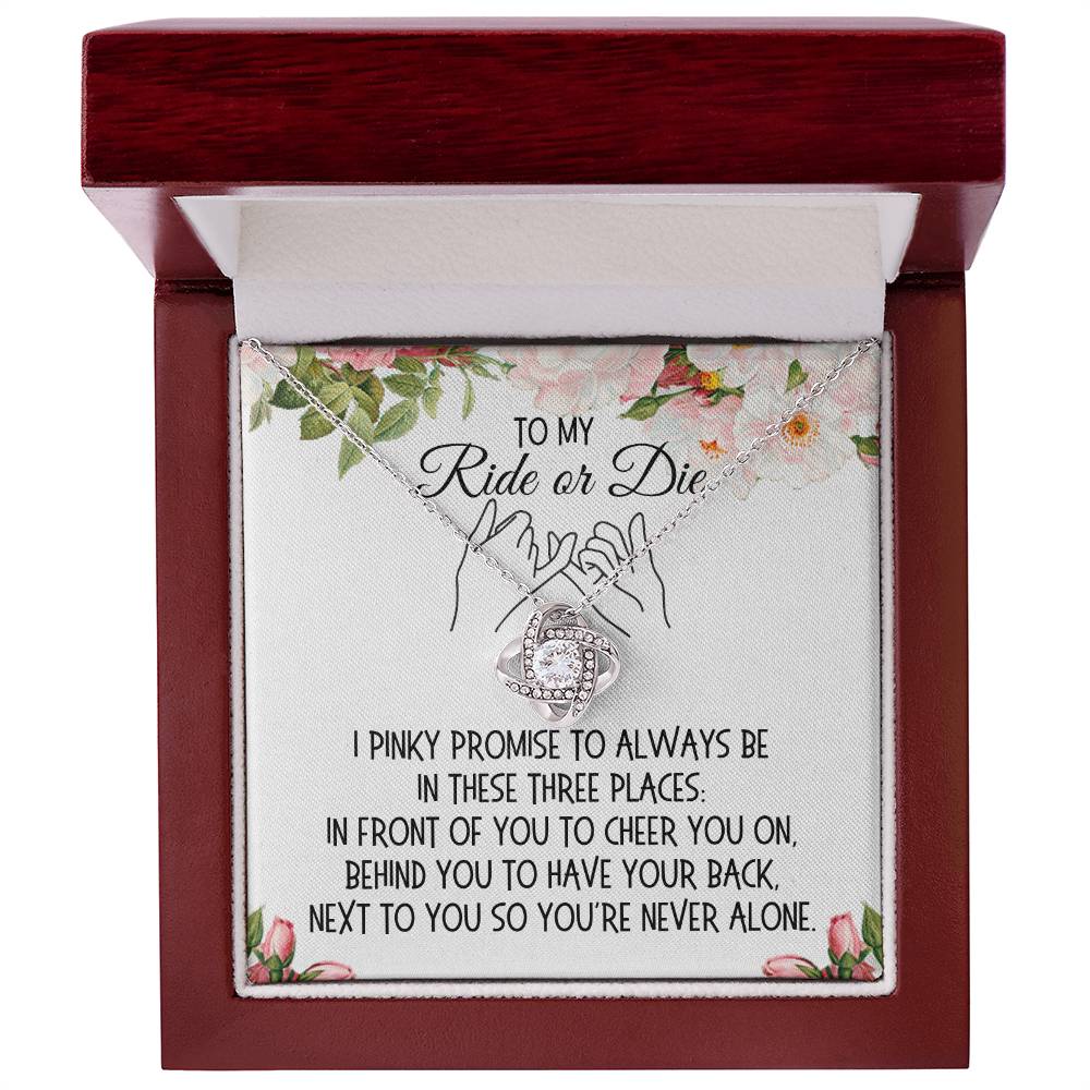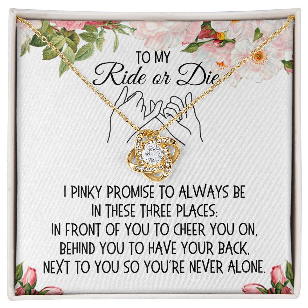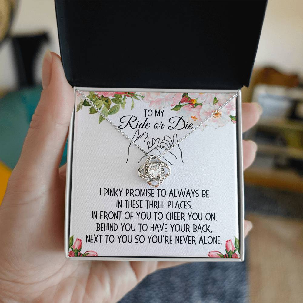 The accompanying message card, adorned with a charming cartoon drawing of flowers, features a heartfelt message: "To my Ride or Die. I pinky promise to always be in these three places: In front of you to cheer you on, behind you to have your back, next to you so you're never alone." This personal touch makes the Love Knot Necklace an unforgettable gift for your best friend, girlfriend, wife, or future wife.