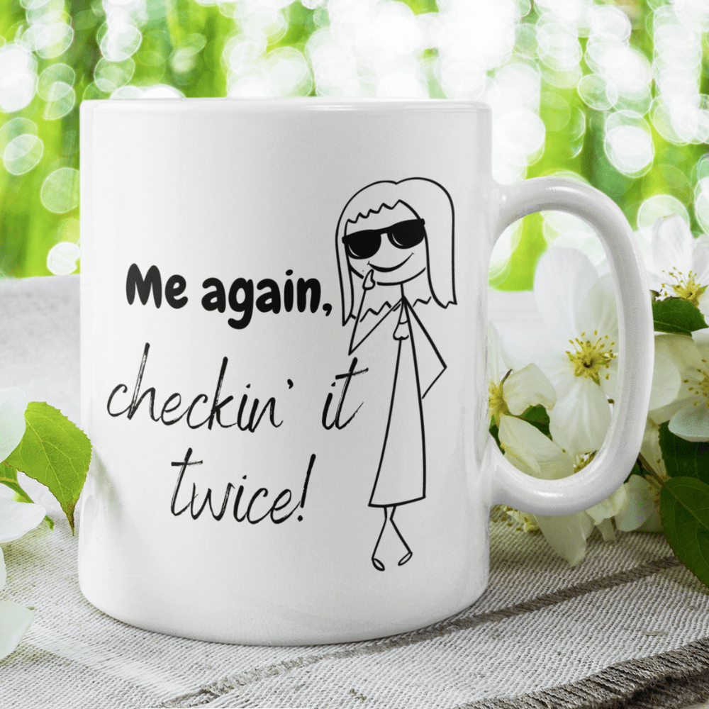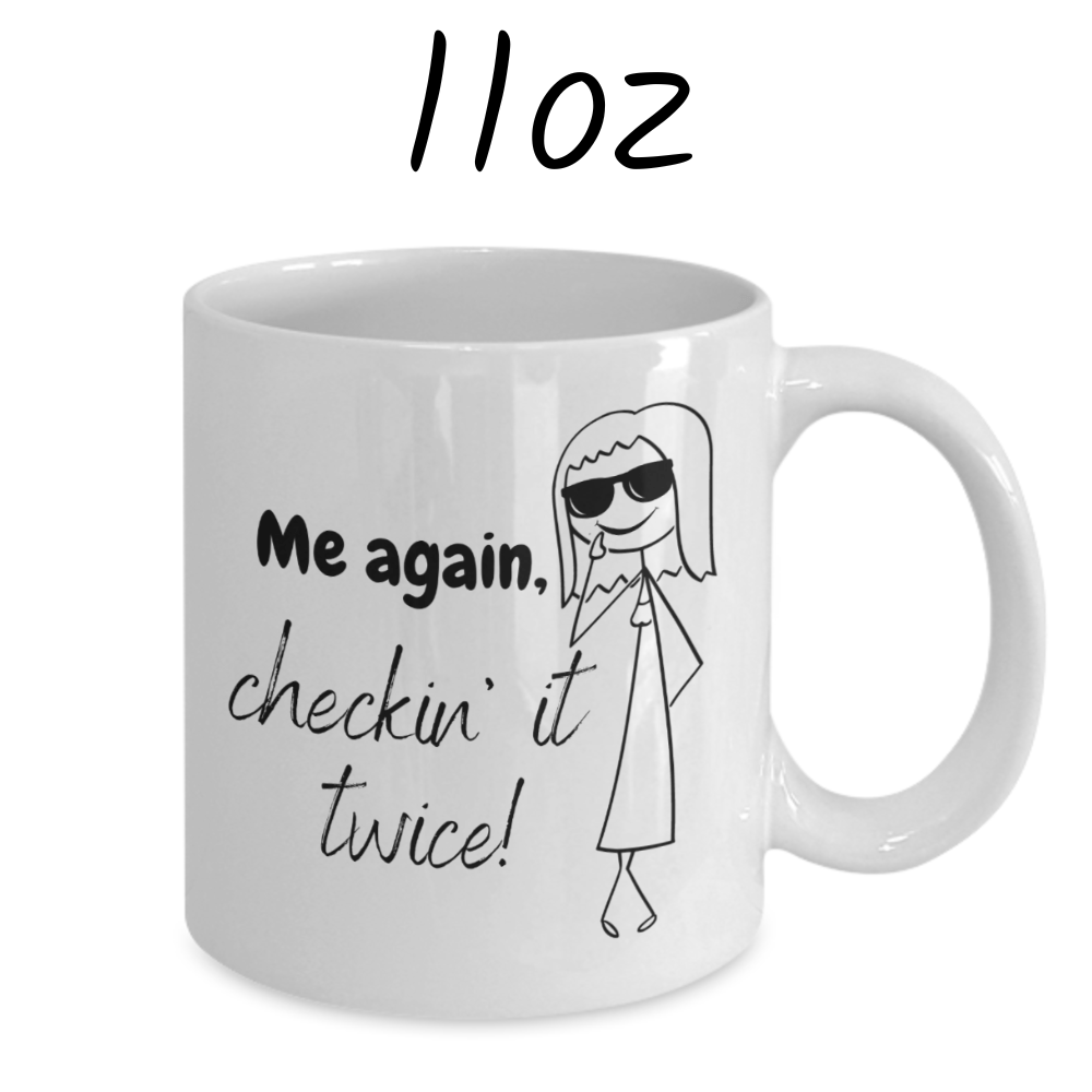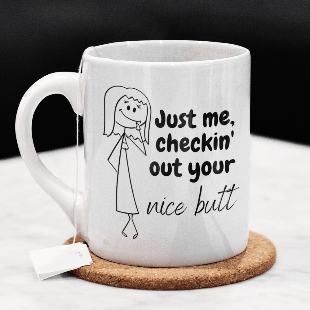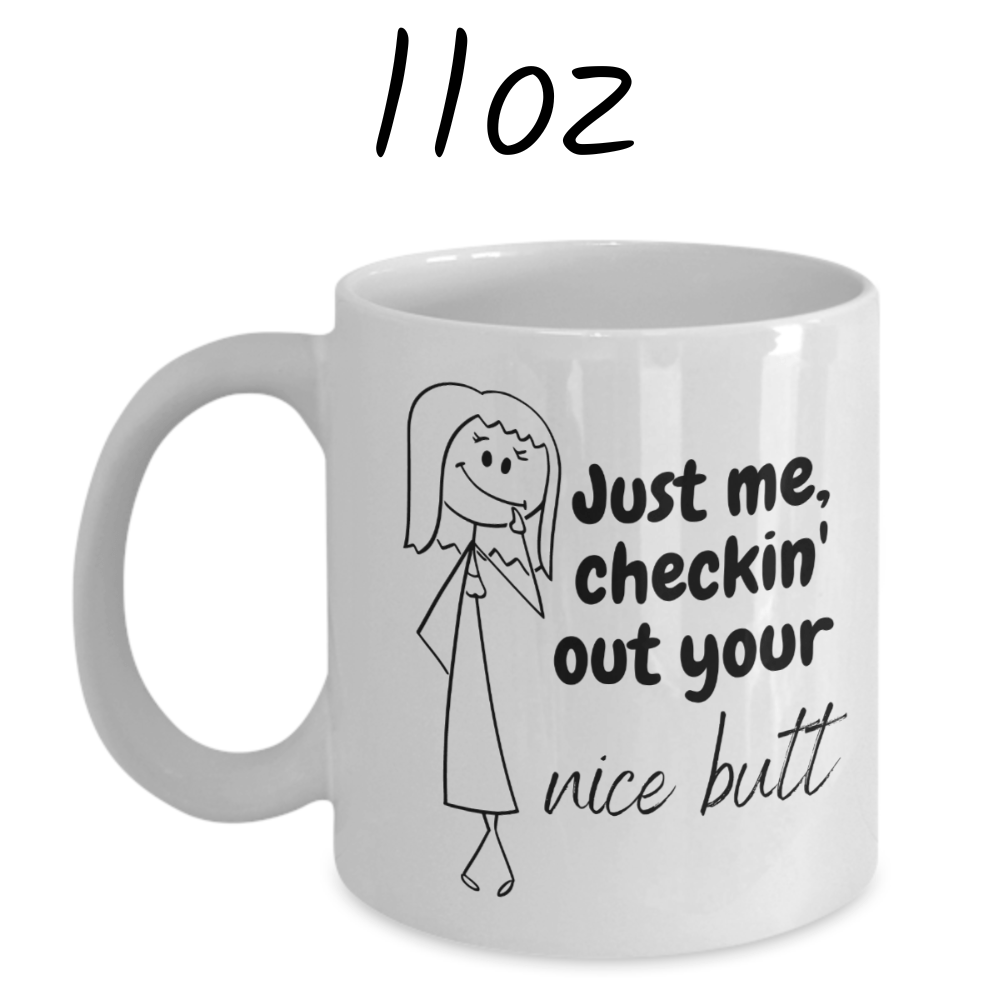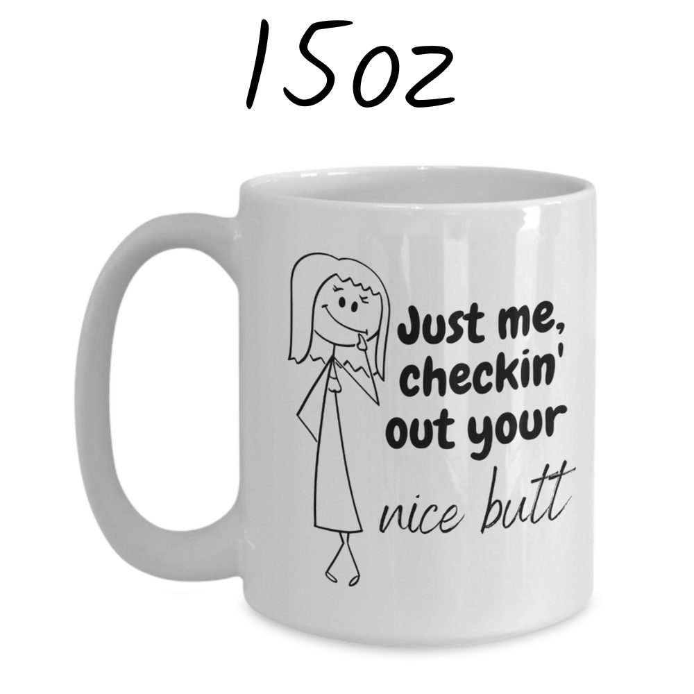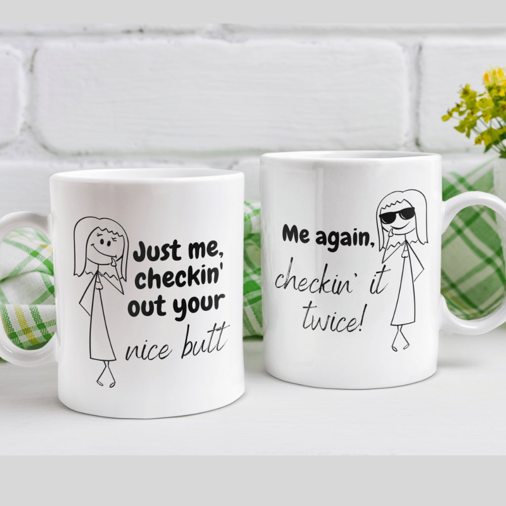 Double-Sided Design: The front side of the mug features the endearing phrase, "Just me, checkin' out your nice butt," while the back side completes the playful exchange with the witty response, "Me again, checkin' it twice!" This delightful design ensures a smile with every sip.