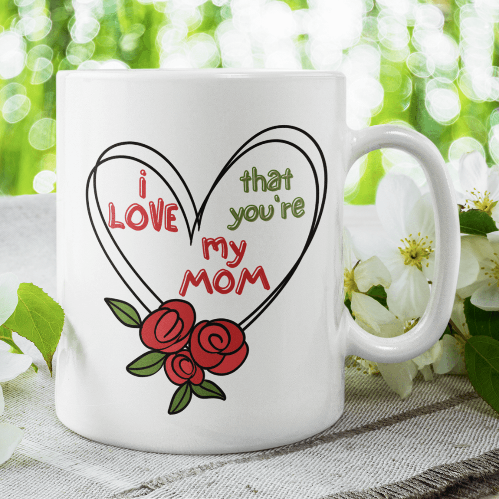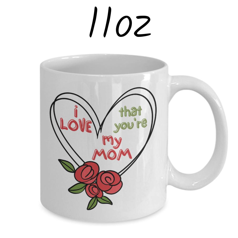 Personalized Customization: Make this gift uniquely special by personalizing the mug with your mom's name, elegantly printed alongside the heartfelt message. Choose from two options: Option 1 features the same design on both sides, while Option 2 adds a special touch with a heartwarming message on the back. The back of the mug features a heart design with the quote "I love that you're my mom", which can also be read as "I love my mom".
