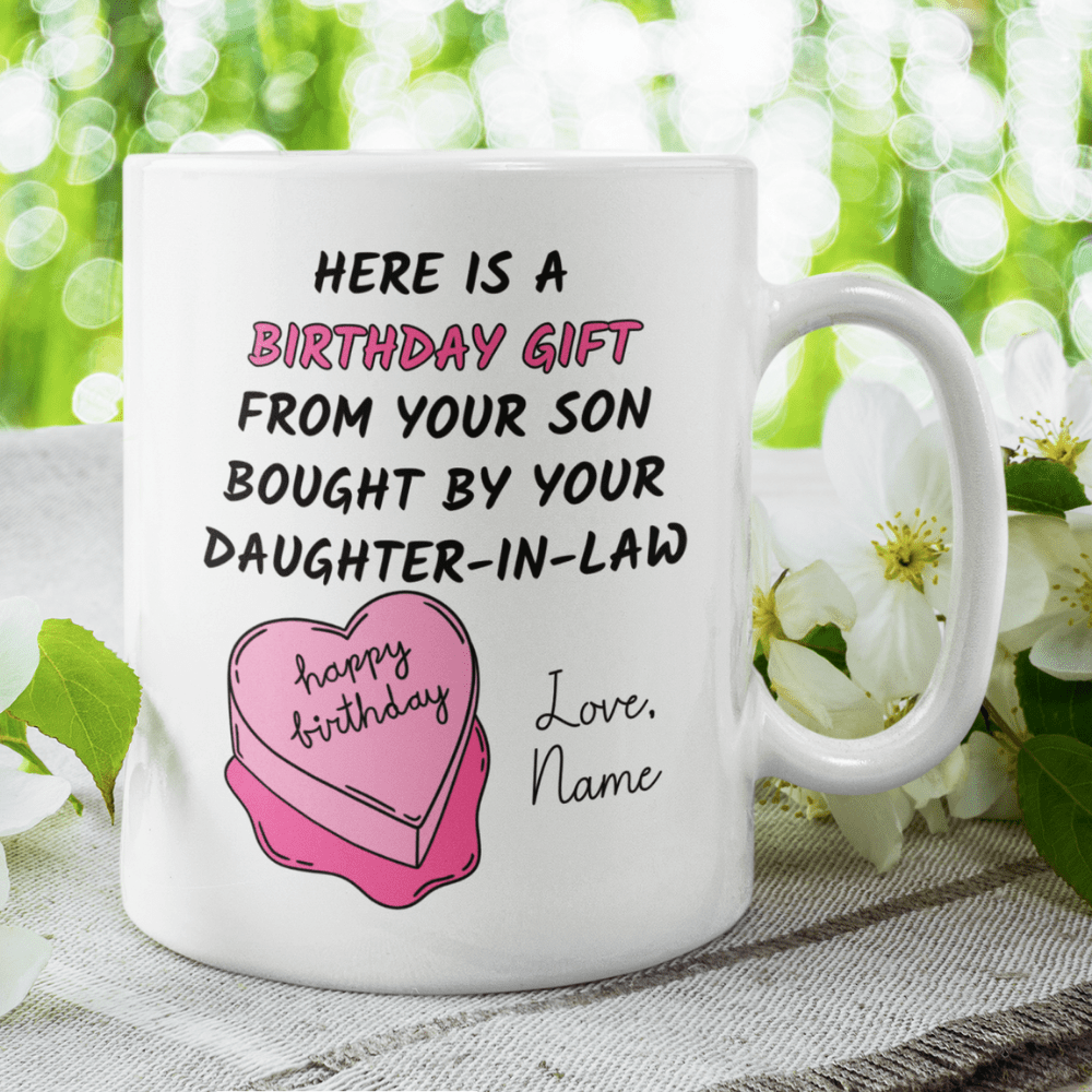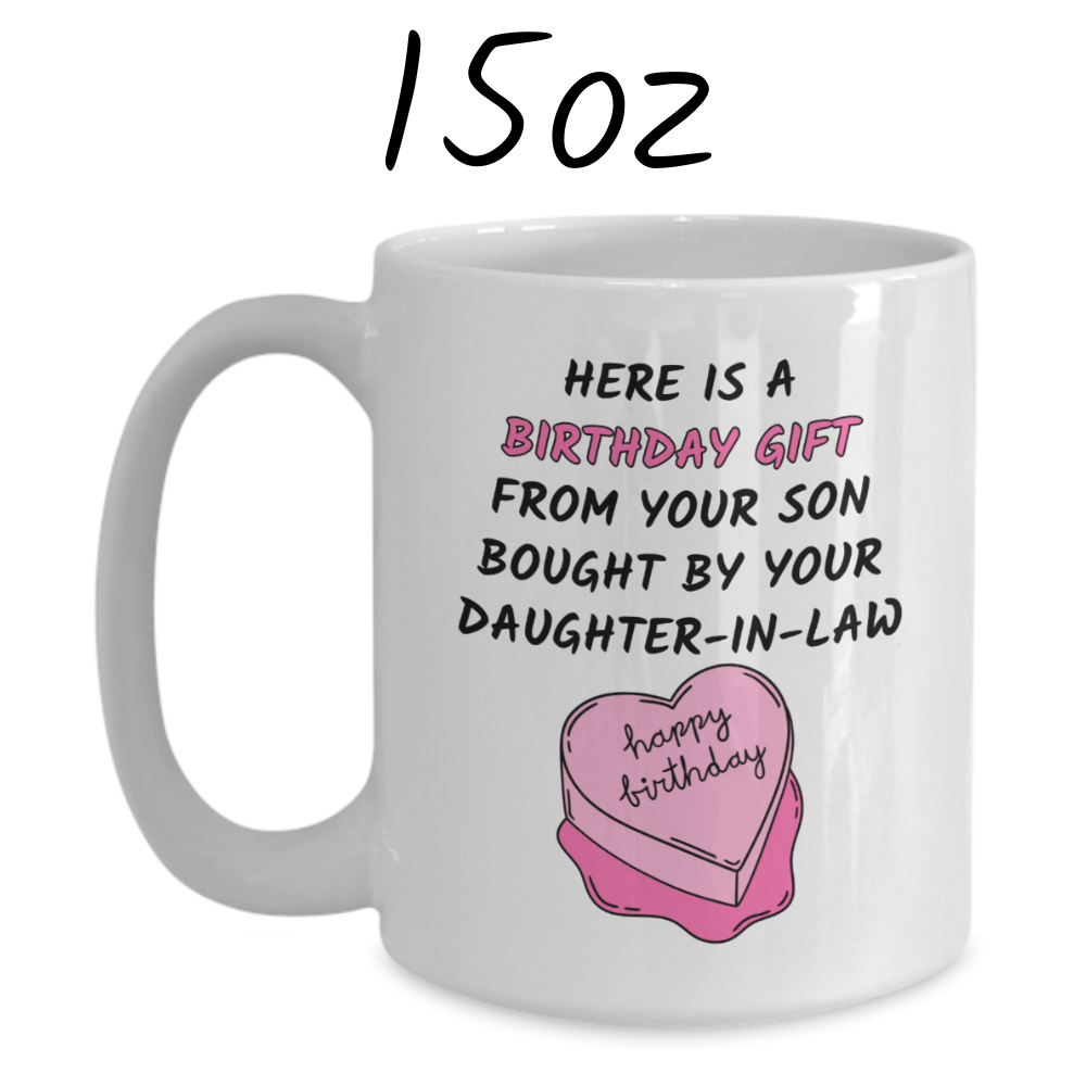 Introducing the perfect blend of humor, affection, and celebration - a white ceramic coffee mug designed especially for your mother-in-law's birthday. Emblazoned with the light-hearted declaration, "HERE IS A BIRTHDAY GIFT FROM YOUR SON BOUGHT BY YOUR DAUGHTER-IN-LAW" and adorned with a charming cartoon drawing of a pink heart-shaped cake proclaiming "Happy Birthday," this mug is sure to become a cherished part of her daily routine.
