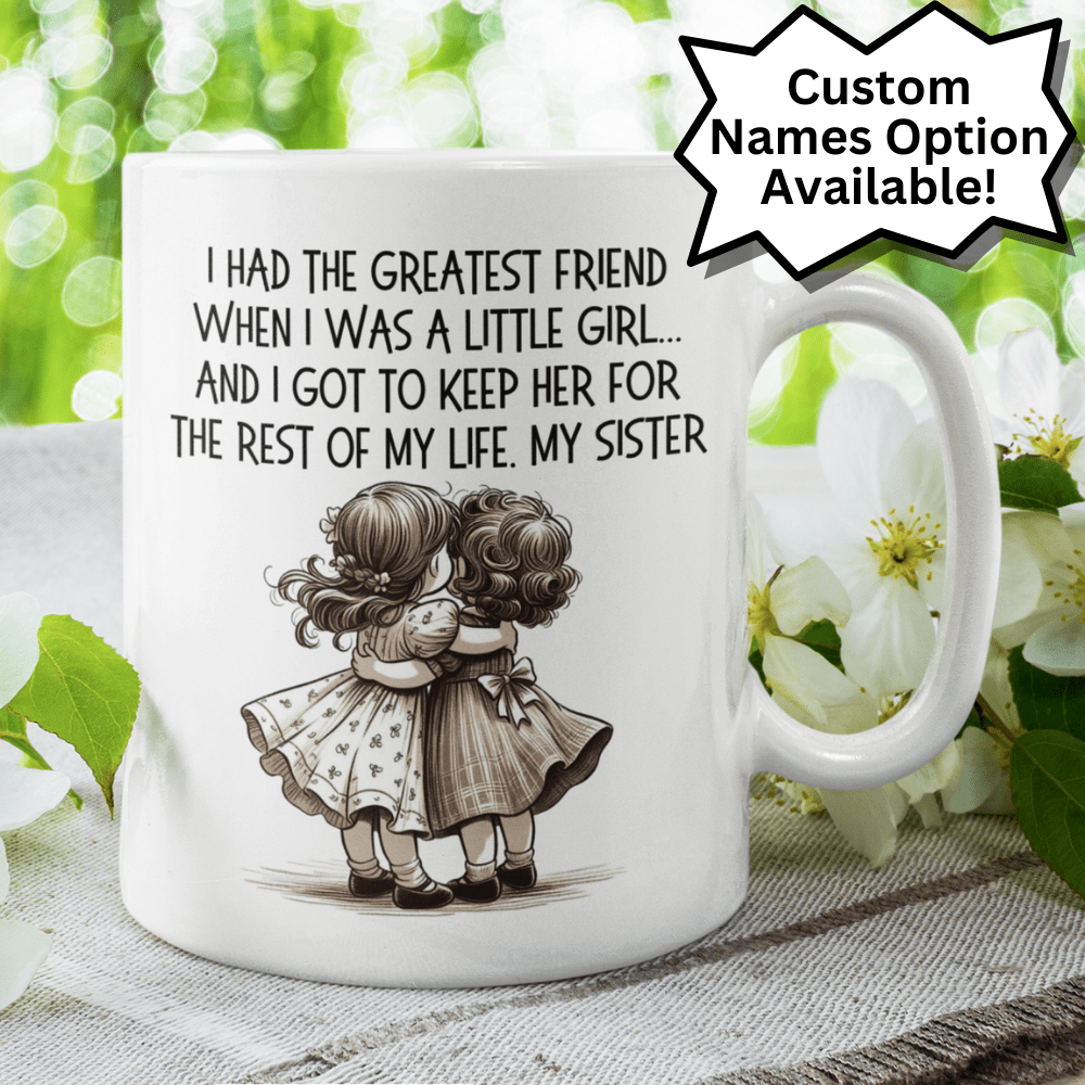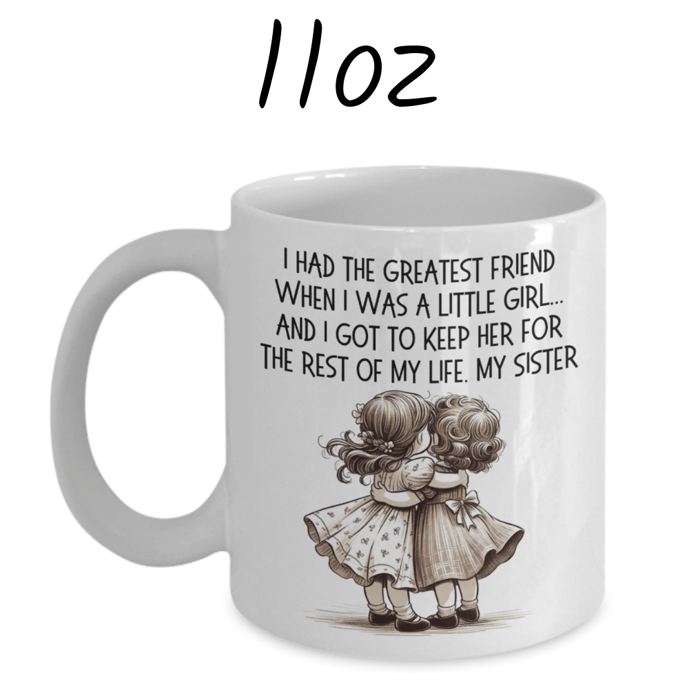 Celebrate the everlasting bond of sisterhood with our sentimental white ceramic coffee mug, adorned with the heartwarming message, "I had the greatest friend when I was a little girl... And I got to keep her for the rest of my life. My Sister" This mug features an adorable cartoon of two little sisters embracing, capturing the essence of sisterly love.