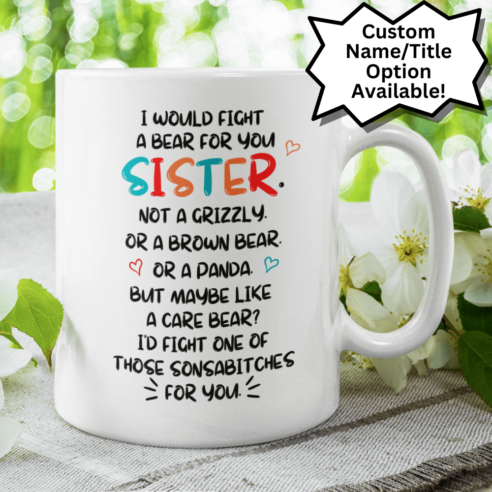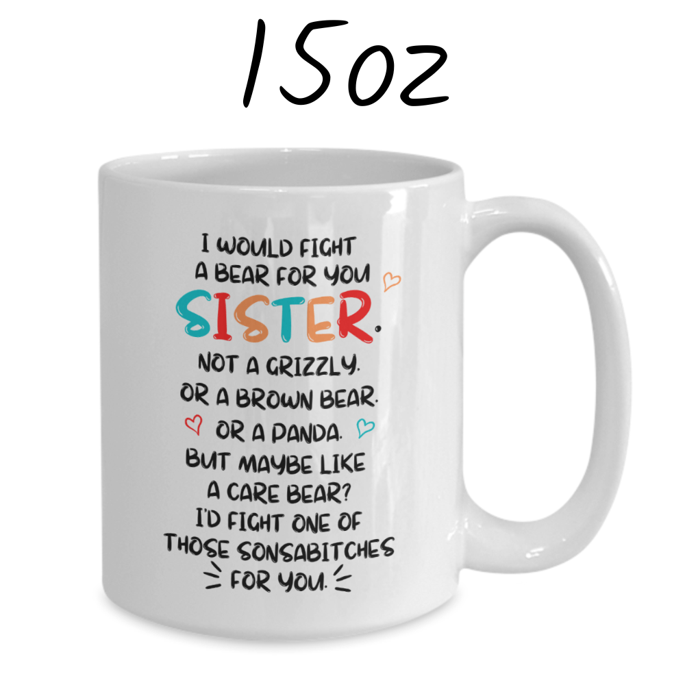 Unleash a dose of humor with our white ceramic coffee mug, perfect for showing your sister, big sis, or little sis just how far you'd go for her, in a comically cautious way. The mug playfully declares, "I would fight a bear for you Sister. Not a grizzly or a brown bear. Or a panda. But maybe like a care bear? I'd fight one of those sonsabitches for you." This lighthearted sentiment is sure to bring a smile and a laugh, making it an excellent gift choice.