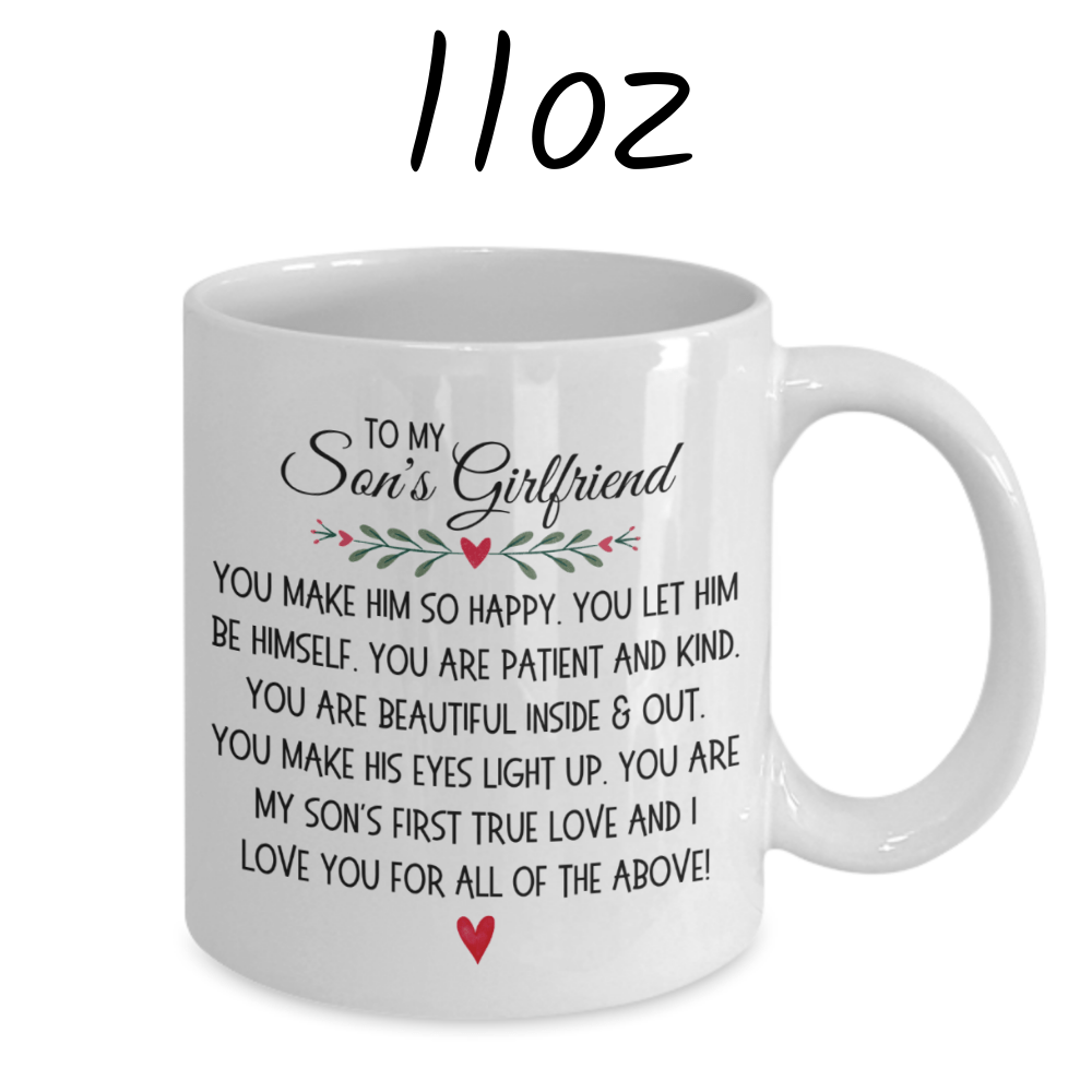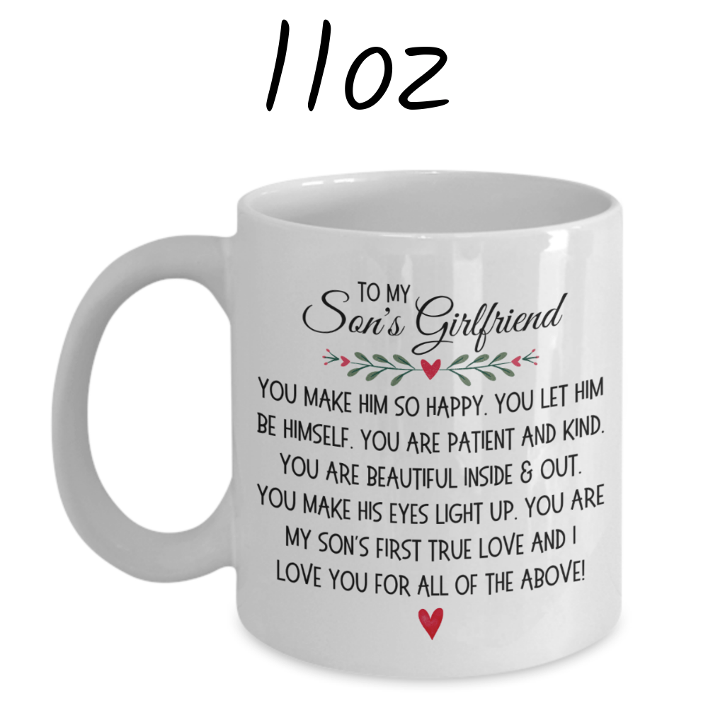 Celebrate the special bond between your son and his girlfriend with our white ceramic coffee mug, adorned with the heartfelt message, "To my Son's Girlfriend. You make him so happy. You let him be himself. You are patient and kind. You are beautiful inside & out. You make his eyes light up. You are my son's first true love and I love you for all of the above!" This mug is a touching tribute to her positive impact on his life and your appreciation for her.