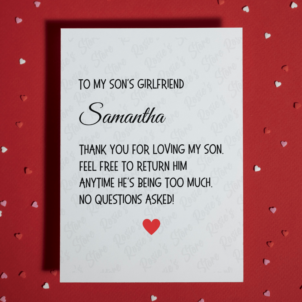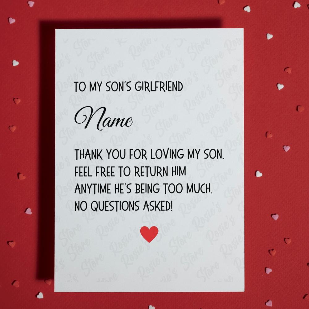 Share a laugh and show your appreciation for your son's girlfriend with our charming and humorous greeting card. This witty card is a fun way to express your gratitude for her and maybe even hint at a lighthearted return policy when it comes to your beloved son!