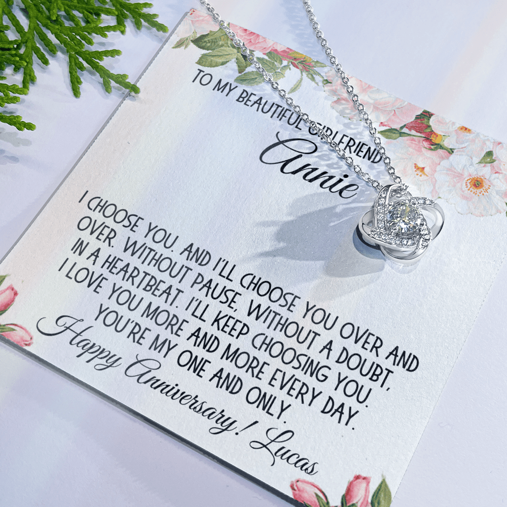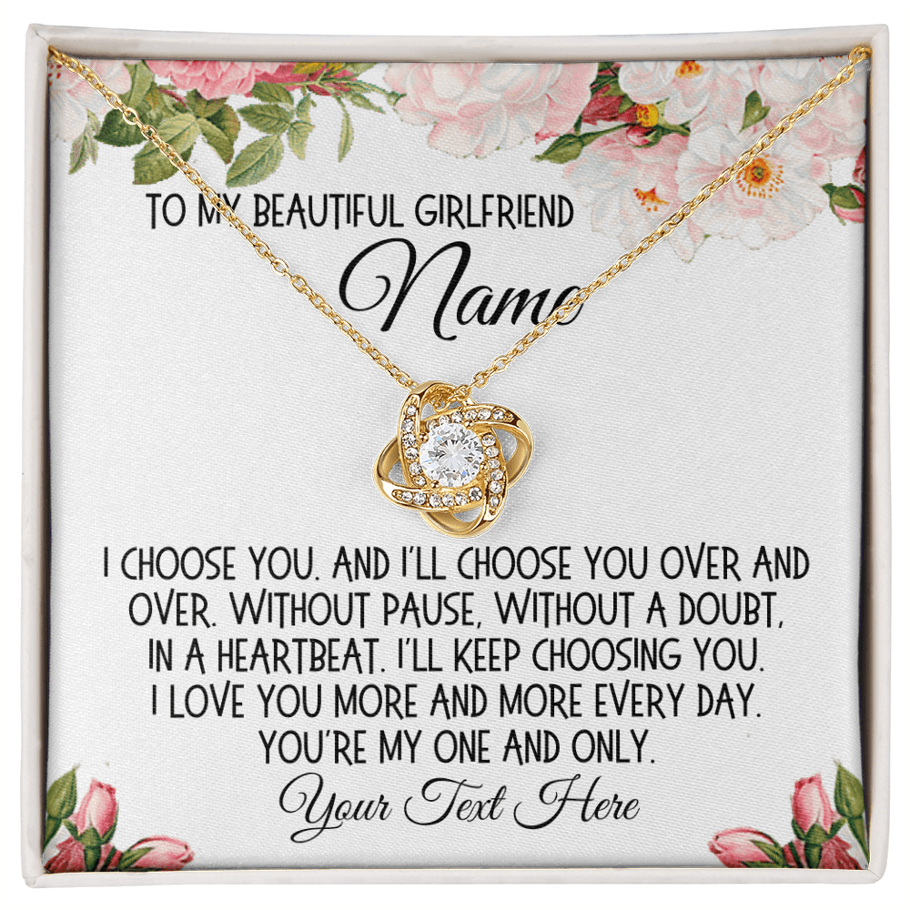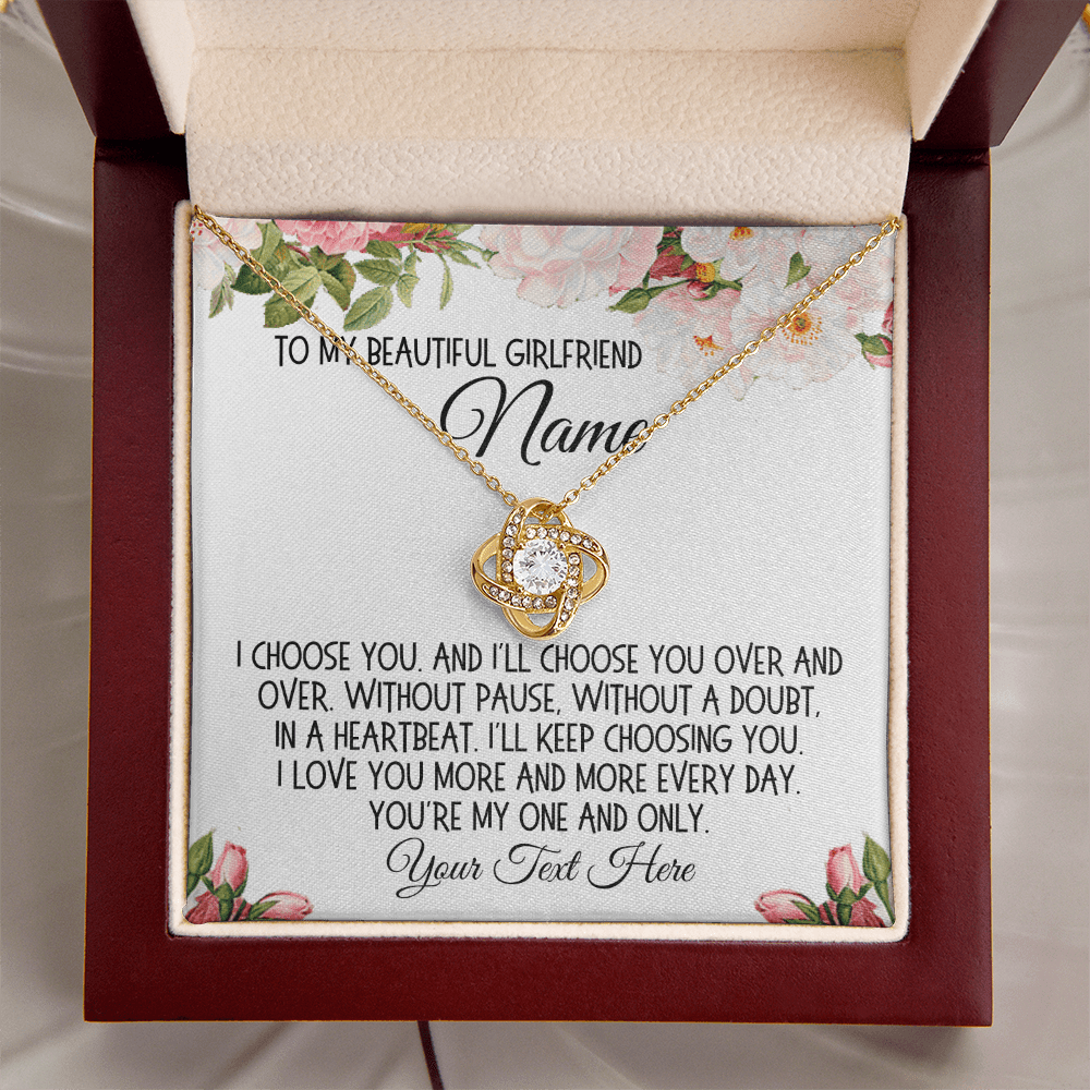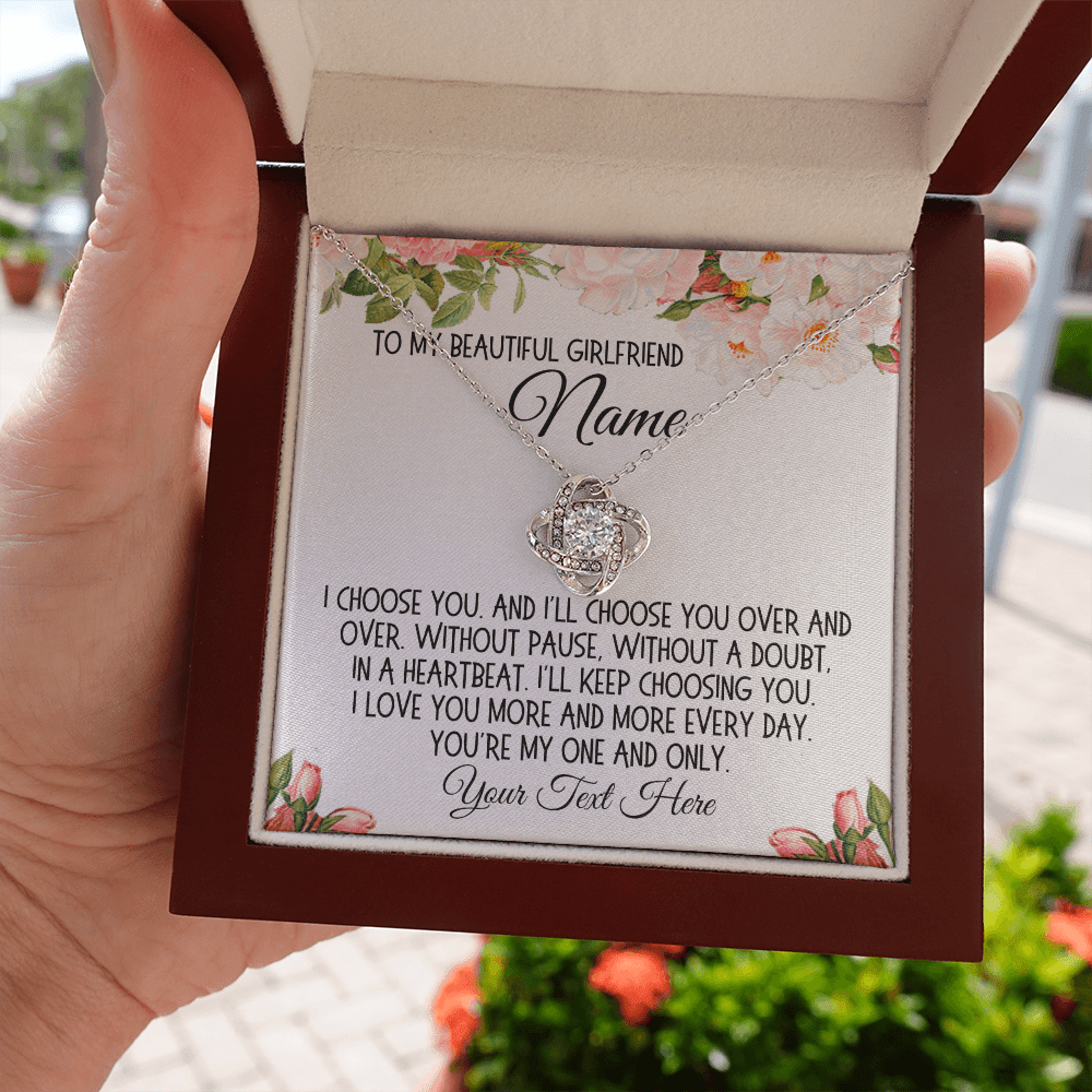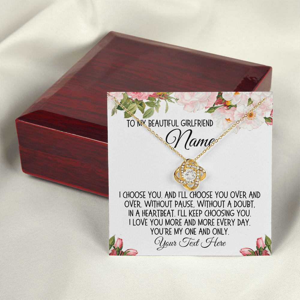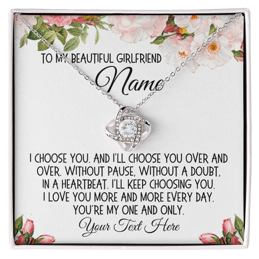 The accompanying message card, embellished with a beautiful cartoon drawing of flowers, includes a heartfelt message that can be personalized with your girlfriend's name and your own words: "To my beautiful girlfriend 'Name'. I choose you. And I'll choose you over and over. Without pause, without a doubt, in a heartbeat. I'll keep choosing you. I love you more and more every day. You're my one and only. 'Your Text Here'." This personalized touch makes the Love Knot Necklace not just a gift, but a treasured keepsake.