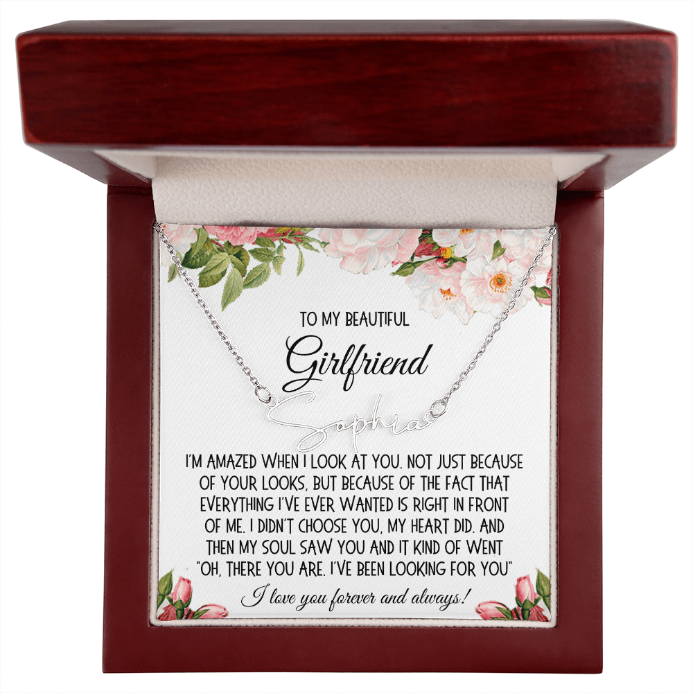 💌 The necklace is accompanied by a lovingly designed message card featuring a beautiful cartoon drawing of flowers and the heartfelt words: "To my beautiful Girlfriend. I'm amazed when I look at you. Not just because of your looks, but because of the fact that everything I've ever wanted is right in front of me. I didn't choose you, my heart did. And then my soul saw you and it kind of went 'Oh, there you are. I've been looking for you.' I love you forever and always!"