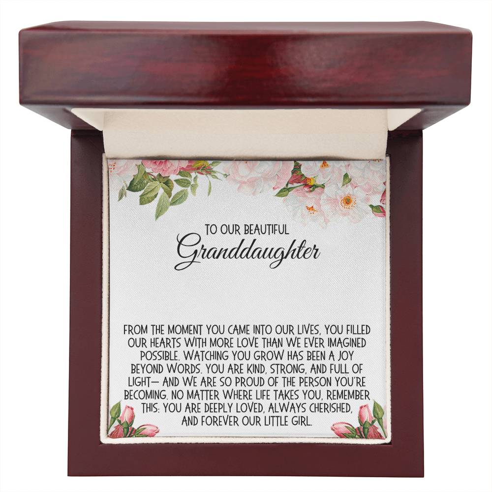 "To our beautiful Granddaughter. From the moment you came into our lives, you filled our hearts with more love than we ever imagined possible. Watching you grow has been a joy beyond words. You are kind, strong, and full of light— and we are so proud of the person you’re becoming. No matter where life takes you, remember this: you are deeply loved, always cherished, and forever our little girl."