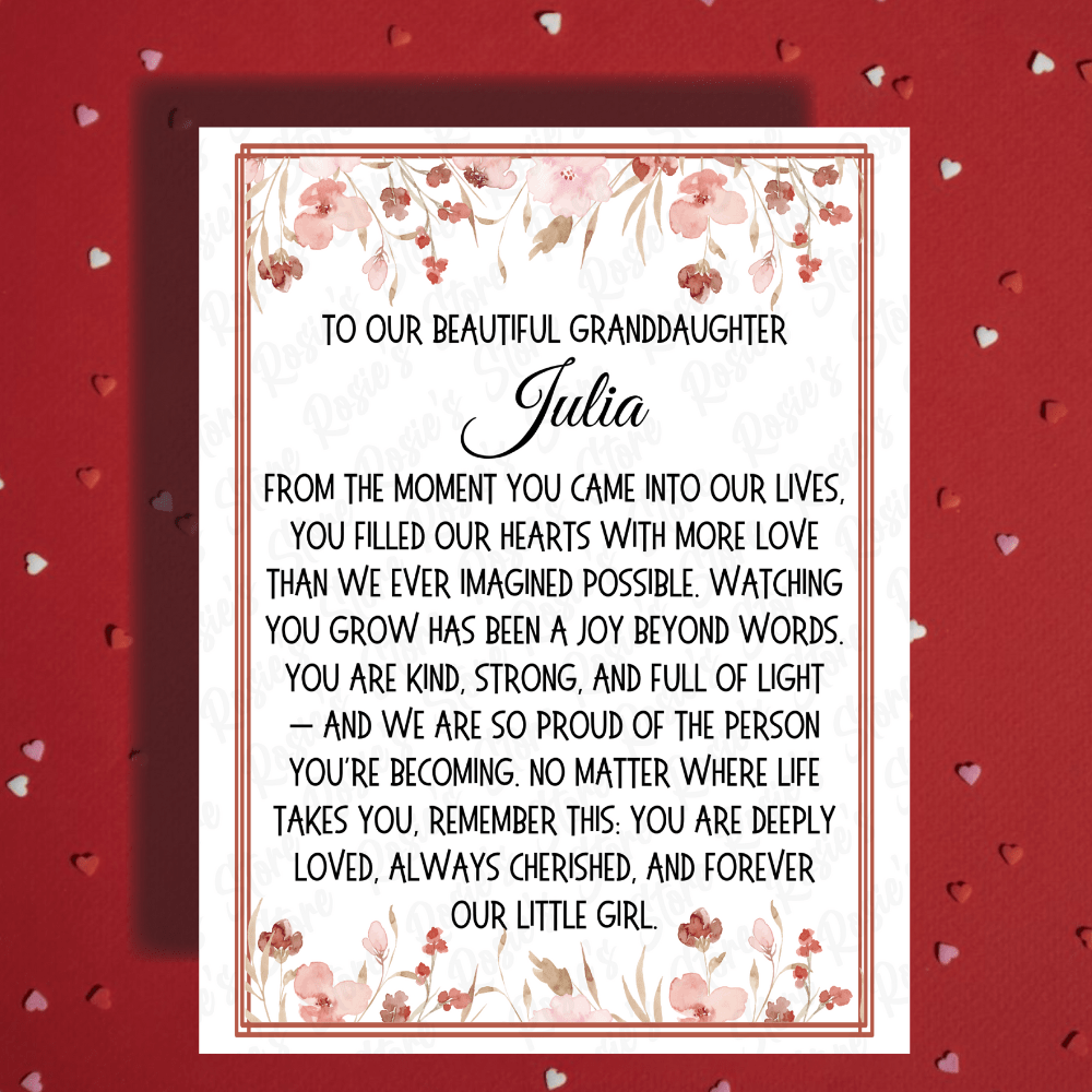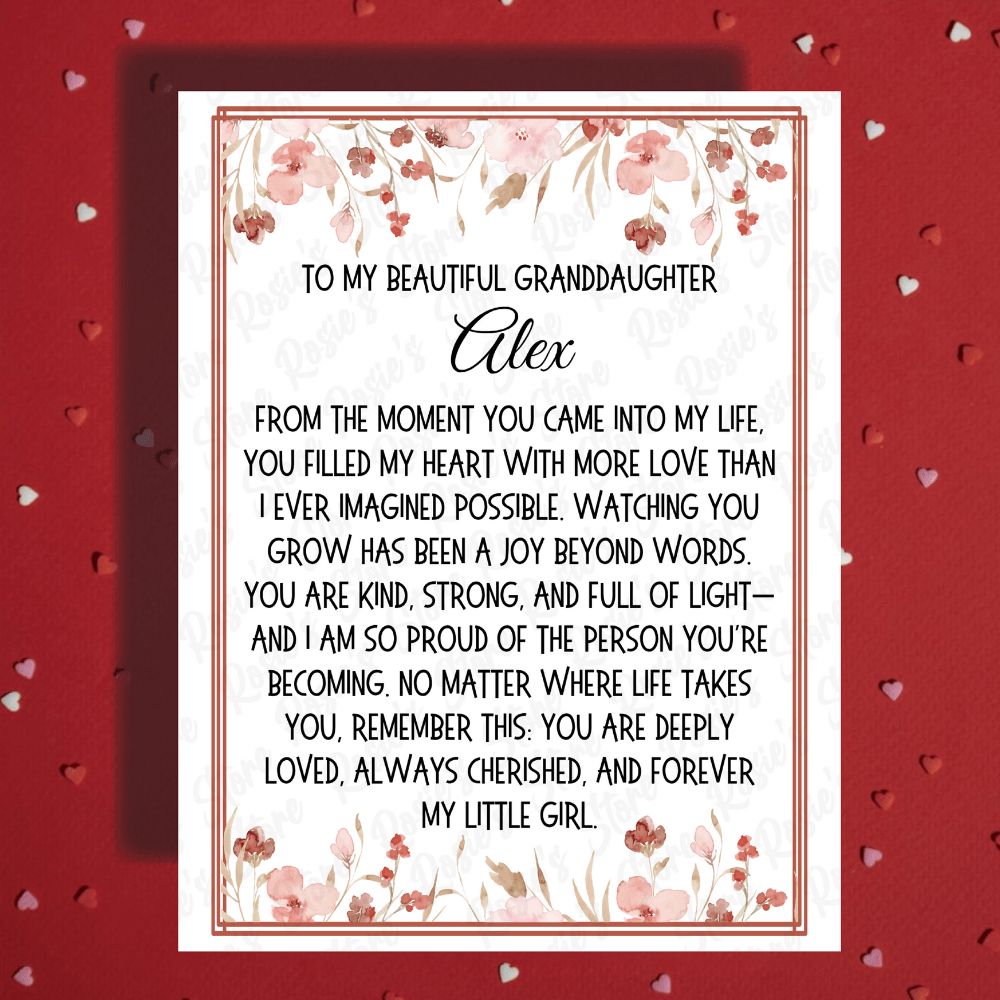 โTo my beautiful Granddaughter. From the moment you came into my life, you filled my heart with more love than I ever imagined possible. Watching you grow has been a joy beyond words. You are kind, strong, and full of lightโ and I am so proud of the person youโre becoming. No matter where life takes you, remember this: you are deeply loved, always cherished, and forever my little girl.โ