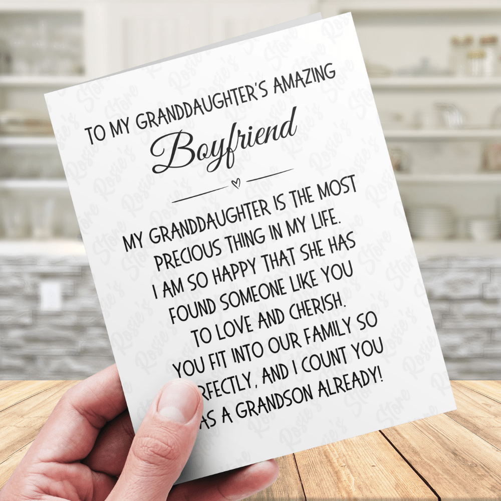 • Text on card: "To my granddaughter's amazing boyfriend. My granddaughter is the most precious thing in my life. I am so happy that she has found someone like you to love and cherish. You fit into our family so perfectly, and I count you as a grandson already!"
