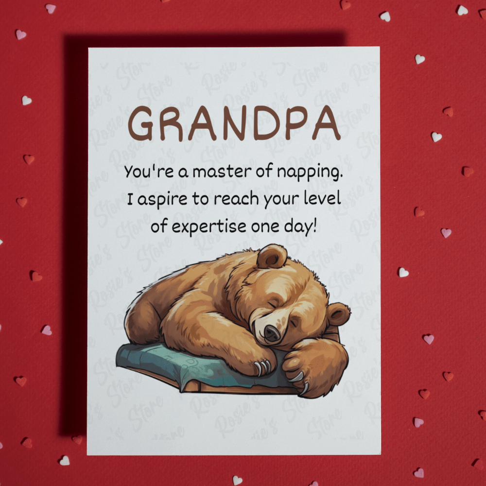 - Front Cover: Features a cute cartoon drawing of a sleeping bear, perfectly embodying the serene and expert napping abilities of your grandpa. The playful message, "Grandpa, You're a master of napping. I aspire to reach your level of expertise one day!" adds a touch of light-hearted fun.