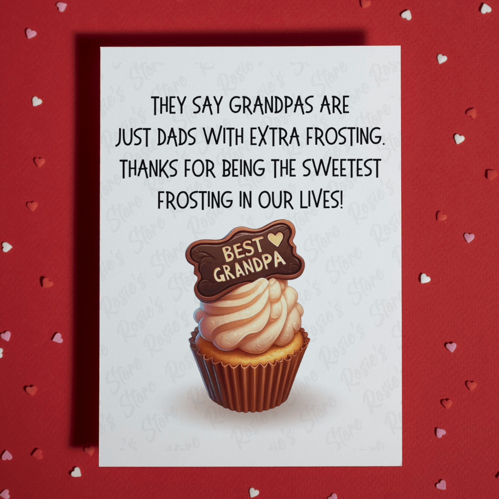 - Front Cover: The card showcases an adorable cartoon drawing of a cupcake topped with generous frosting and a chocolate sign that reads "BEST GRANDPA." It's accompanied by the charming message, "They Say Grandpas Are Just Dads with Extra Frosting. Thanks for Being the Sweetest Frosting in Our Lives!" This imagery and wording beautifully symbolize how he enriches your lives with extra layers of love and joy.