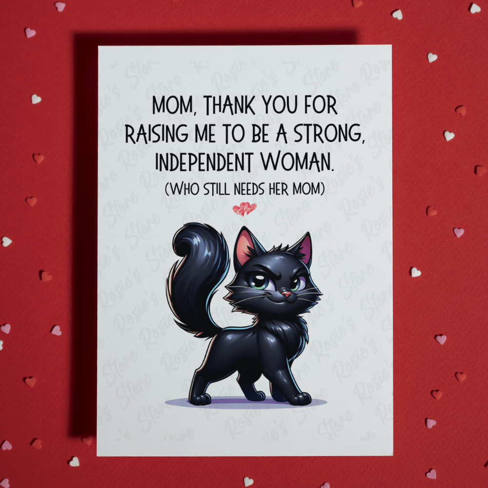 - Front Cover: Features an adorable cartoon drawing of a proud black cat, symbolizing the strength and independence you've gained from your mom, accompanied by the message, "Mom, thank you for raising me to be a strong, independent woman. (who still needs her mom)." This light-hearted yet poignant statement is perfect for showing appreciation while acknowledging your lasting bond.