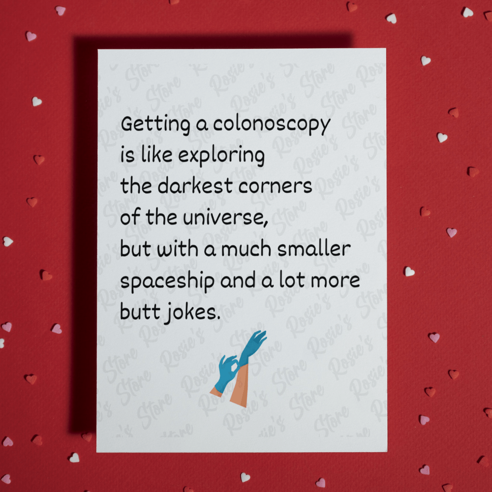 The front of the card reads "Getting a colonoscopy is like exploring the darkest corners of the universe, but with a much smaller spaceship and a lot more butt jokes." While this may seem like a lighthearted joke, it can actually serve as a way to help alleviate some of the stress and anxiety that can come with undergoing this procedure.