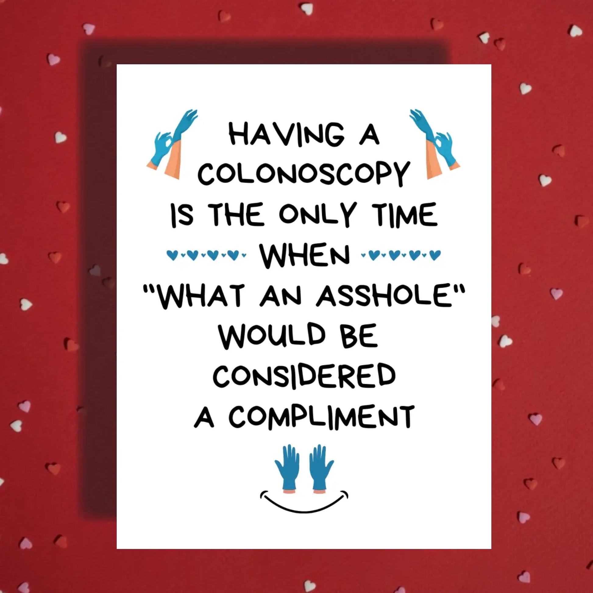 The front of the card reads "Having a colonoscopy is the only time when 'What an asshole' would be considered a compliment." While this may seem like a lighthearted joke, it can actually serve as a way to help alleviate some of the stress and anxiety that can come with undergoing this procedure.