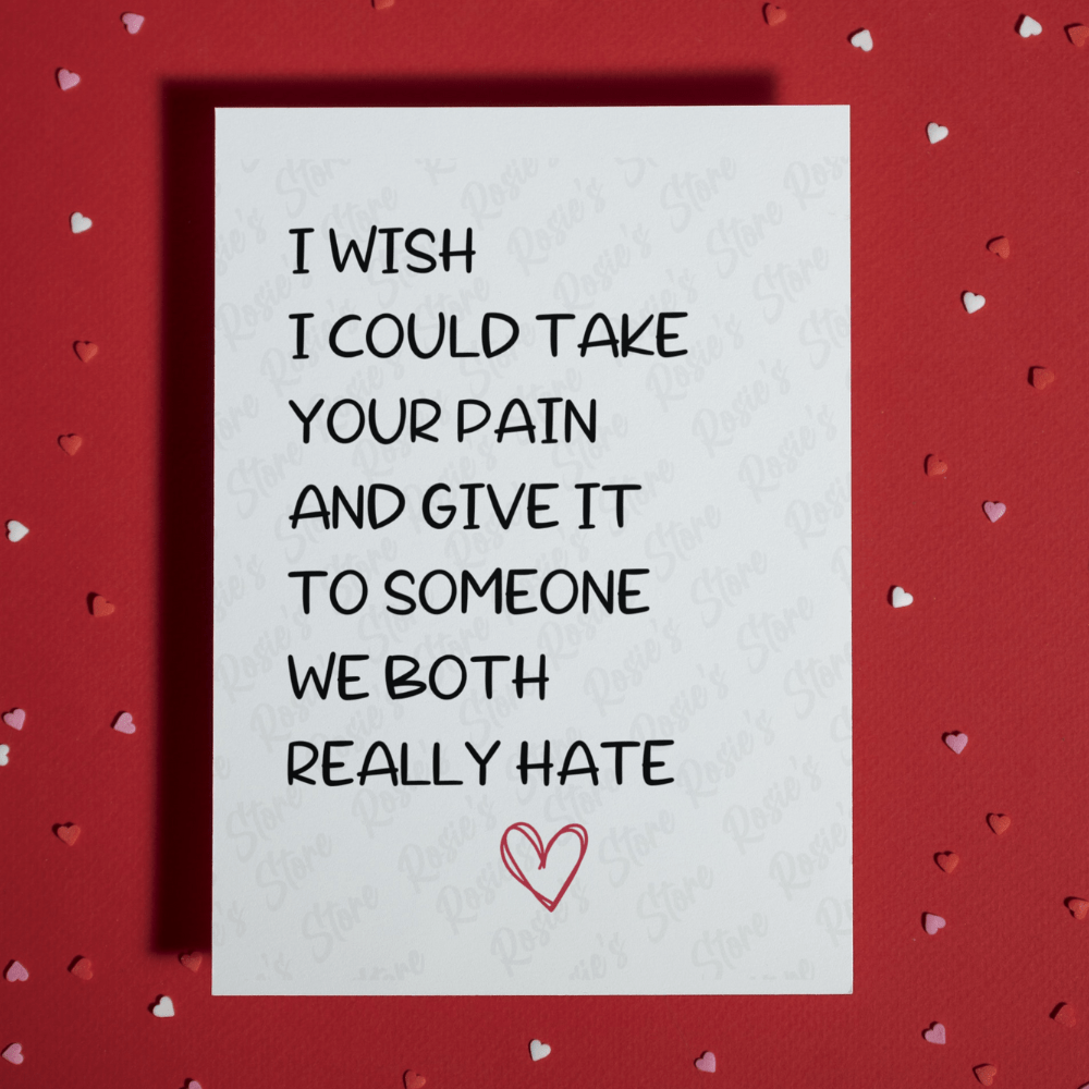 Send some laughter and empathy to a loved one facing challenging times with our unique and humorous greeting card! Our "I wish I could take your pain and give it to someone we both really hate" card is a heartfelt way to show your support and provide a little humor during difficult moments.