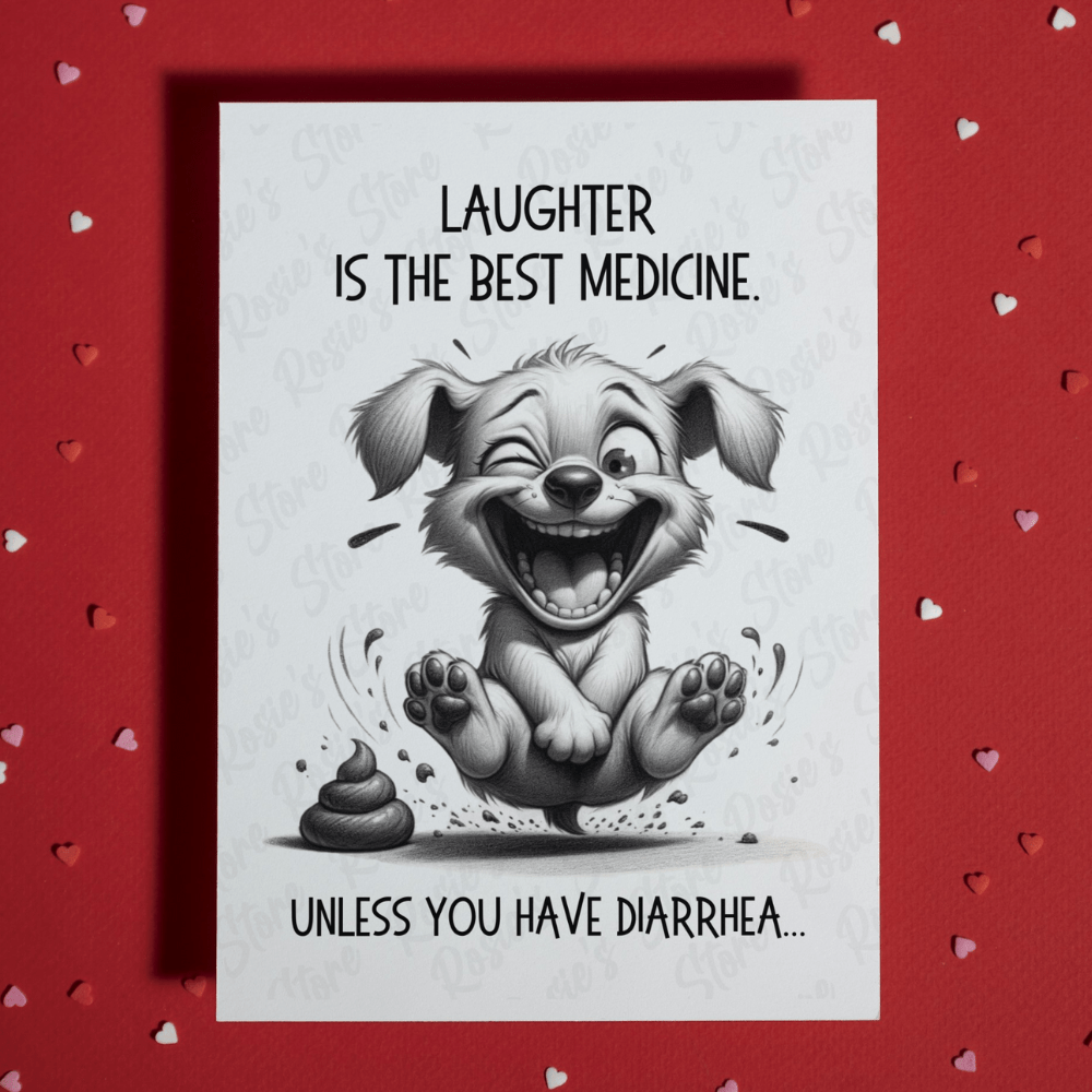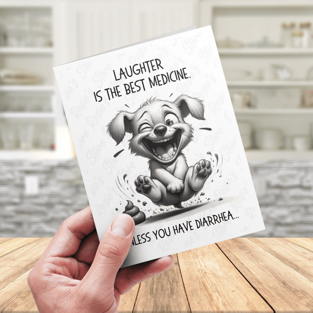 Inject a dose of humor into someone's day with our whimsically funny greeting card, perfect for lightening the mood and bringing a smile. Featuring the playful adage, "Laughter is the best medicine. Unless you have diarrhea..." alongside a charming pencil drawing of a puppy caught in a bout of hearty laughter, this card is sure to tickle the funny bone.