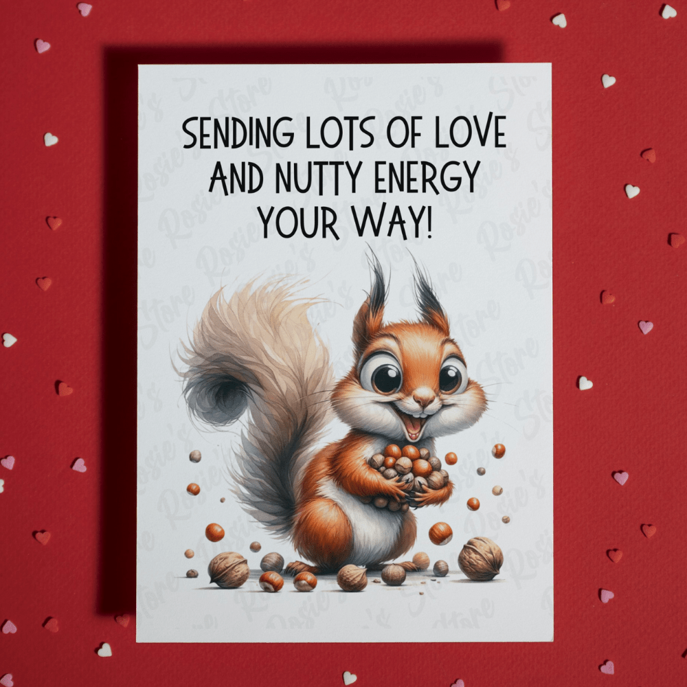 Brighten someone's day with our charming greeting card featuring the playful message, "Sending lots of love and nutty energy your way" accompanied by a delightful watercolor drawing of a spirited squirrel. This card is designed to inject a burst of cheer and encouragement, perfect for anyone needing a little lift.