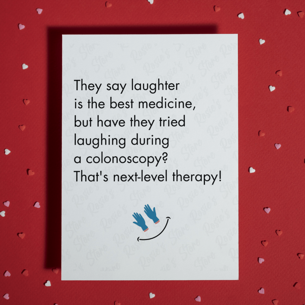 The front of the card reads "They say laughter is the best medicine, but have they tried laughing during a colonoscopy? That's next-level therapy!" While this may seem like a lighthearted joke, it can actually serve as a way to help alleviate some of the stress and anxiety that can come with undergoing this procedure.
