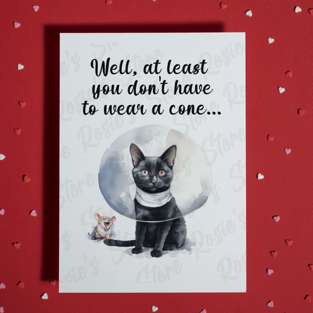 Hey there! It's time to say goodbye to feeling under the weather and hello to feeling like a million bucks. Our "Well, at least you don't have to wear a cone" greeting card is here to help you do just that.