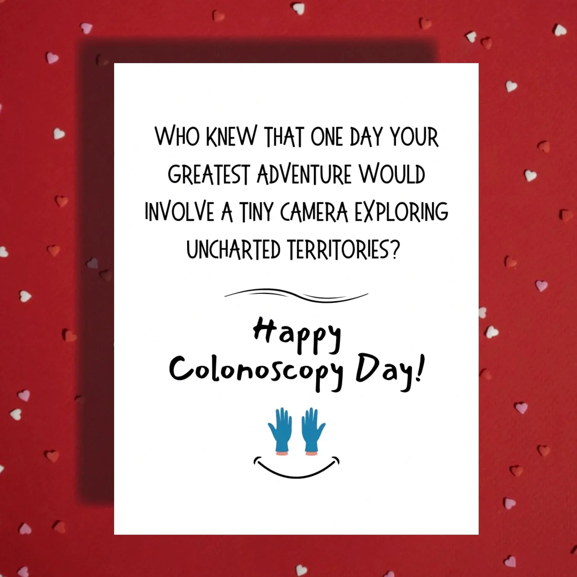 The front of the card reads "Who knew that one day your greatest adventure would involve a tiny camera exploring uncharted territories? Happy Colonoscopy Day!" While this may seem like a lighthearted joke, it can actually serve as a way to help alleviate some of the stress and anxiety that can come with undergoing this procedure.